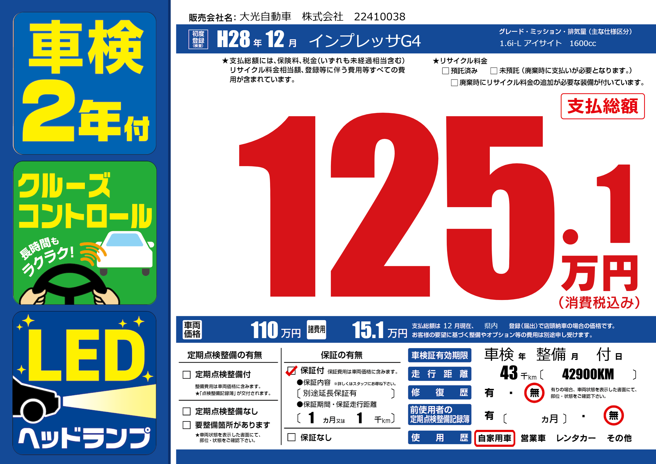 | 車名 | インプレッサG4 | グレード ミッション 排気量 |
