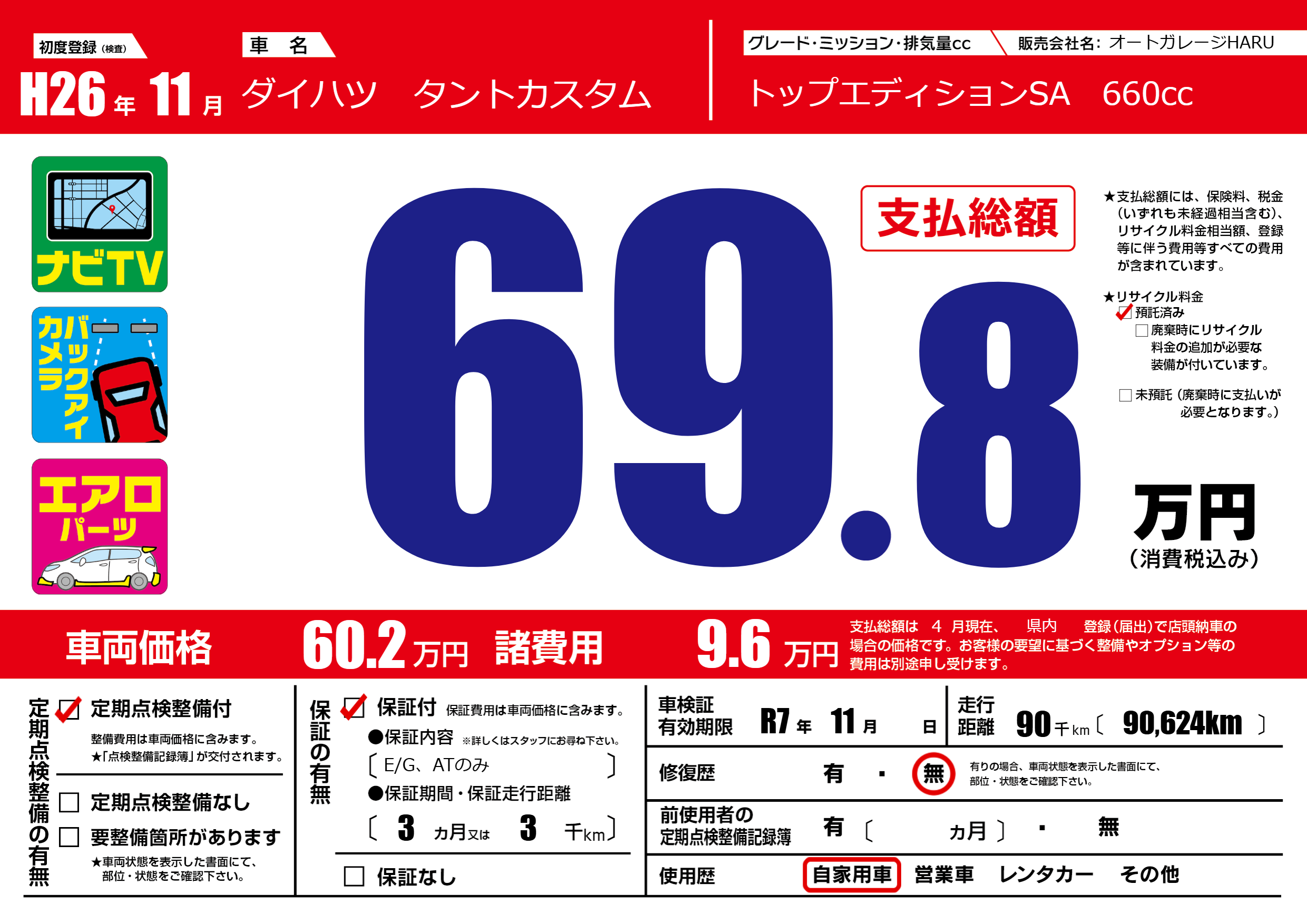 | 走行キロ | 9万km | 初年度登録 | H26年11月 |