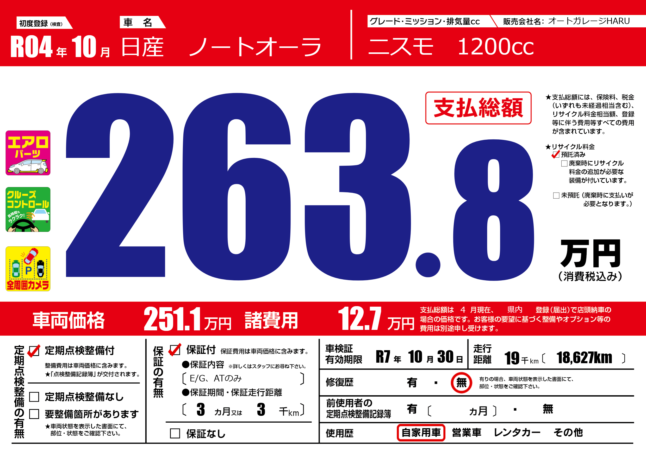 | 車名 | 日産 ノートオーラ | グレード ミッション 排気量 |