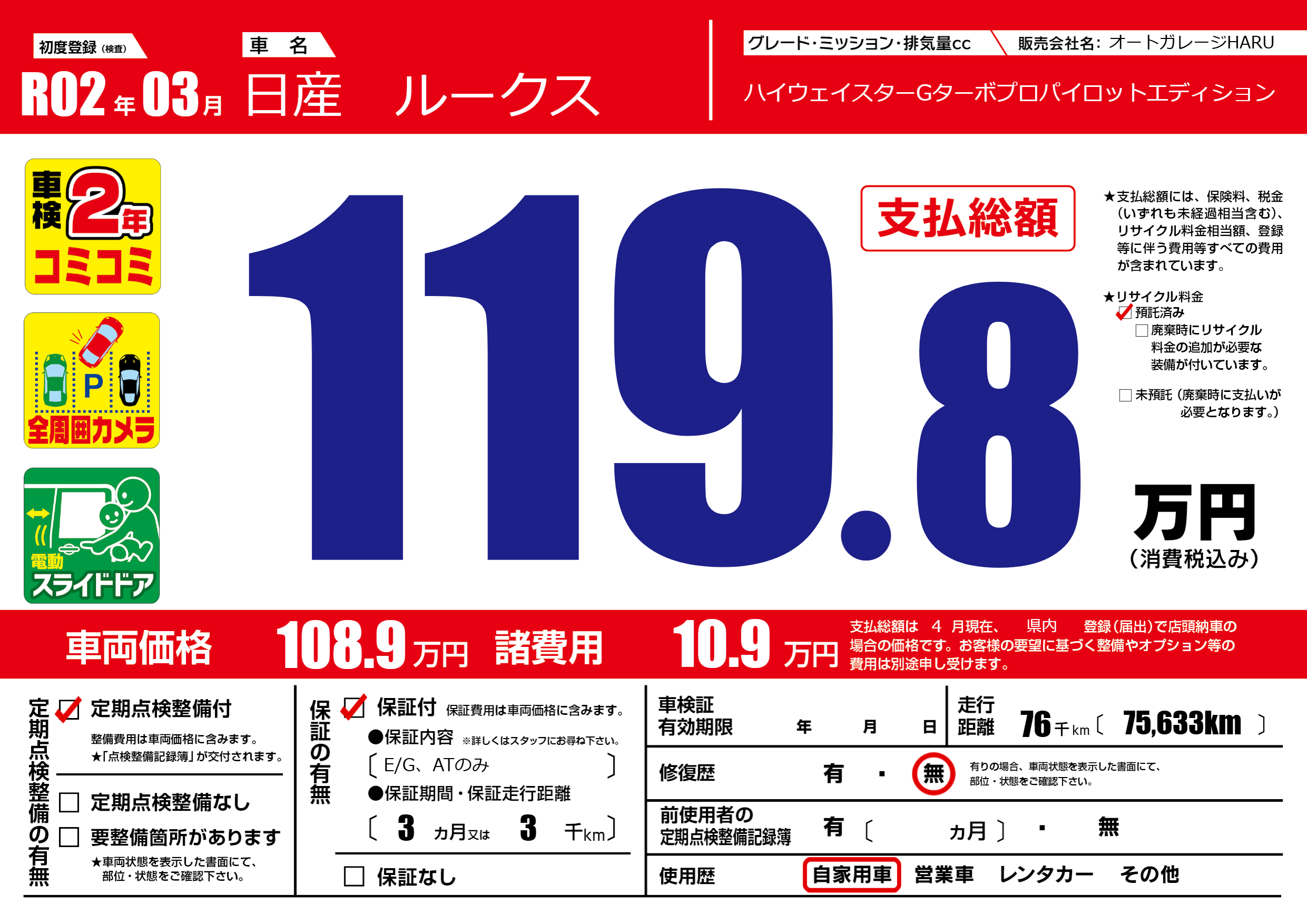 | 走行キロ | 7.6万km | 初年度登録 | R02年03月 |