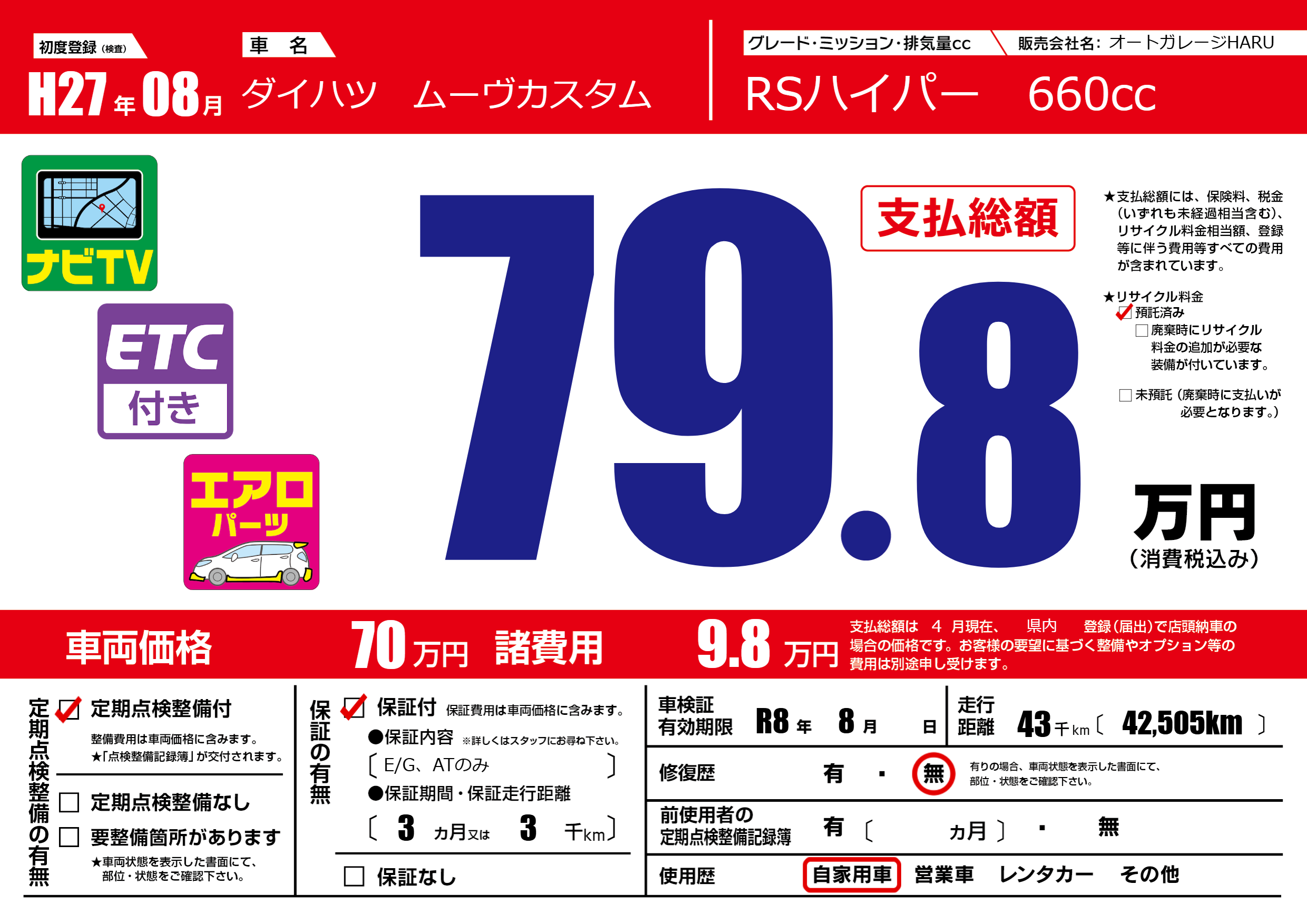 | 走行キロ | 4.3万km | 初年度登録 | H27年08月 |