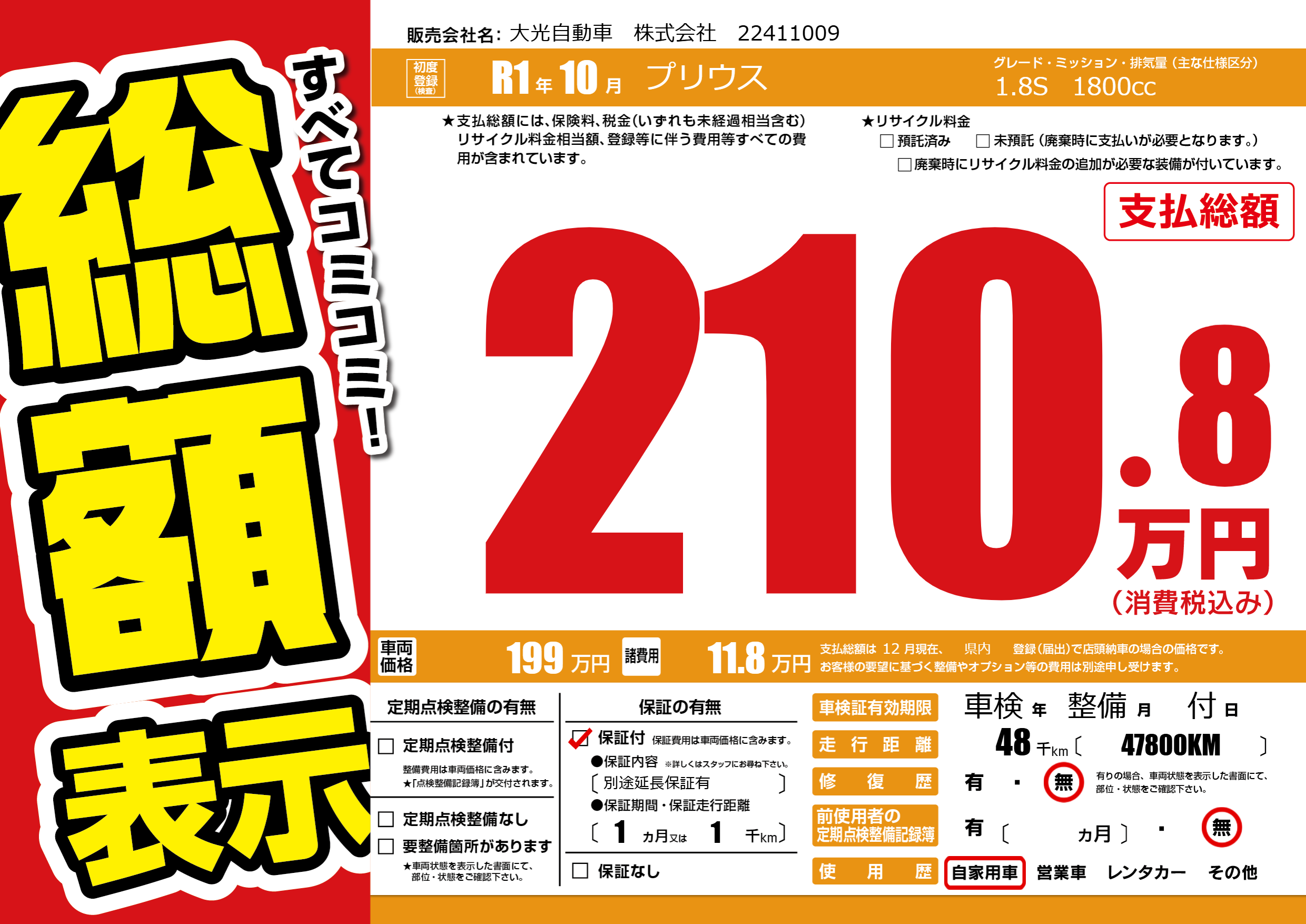 | 車名 | プリウス | グレード ミッション 排気量 |