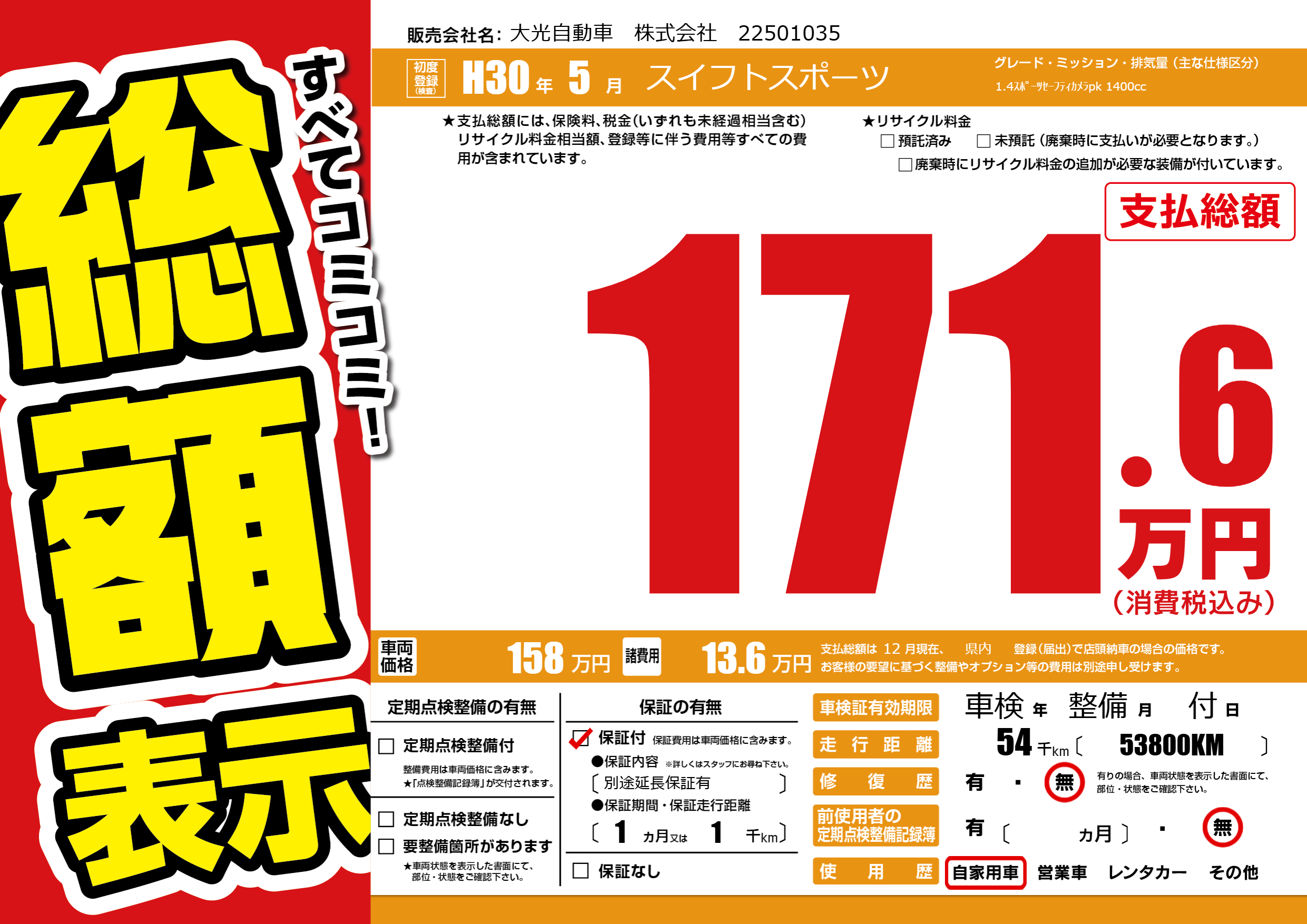 | 車名 | スイフトスポーツ | グレード ミッション 排気量 |