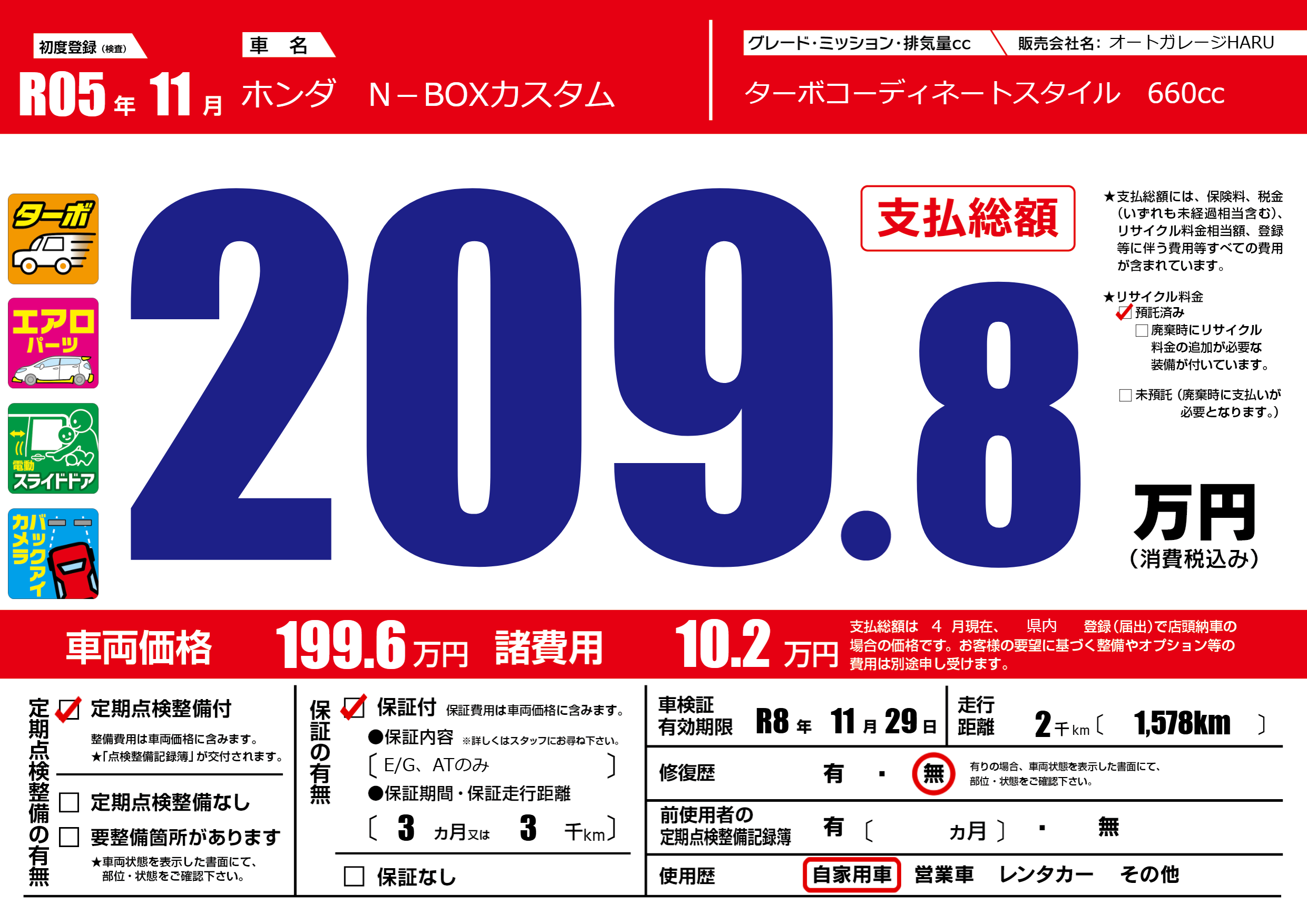 | 走行キロ | 0.2万km | 初年度登録 | R05年11月 |