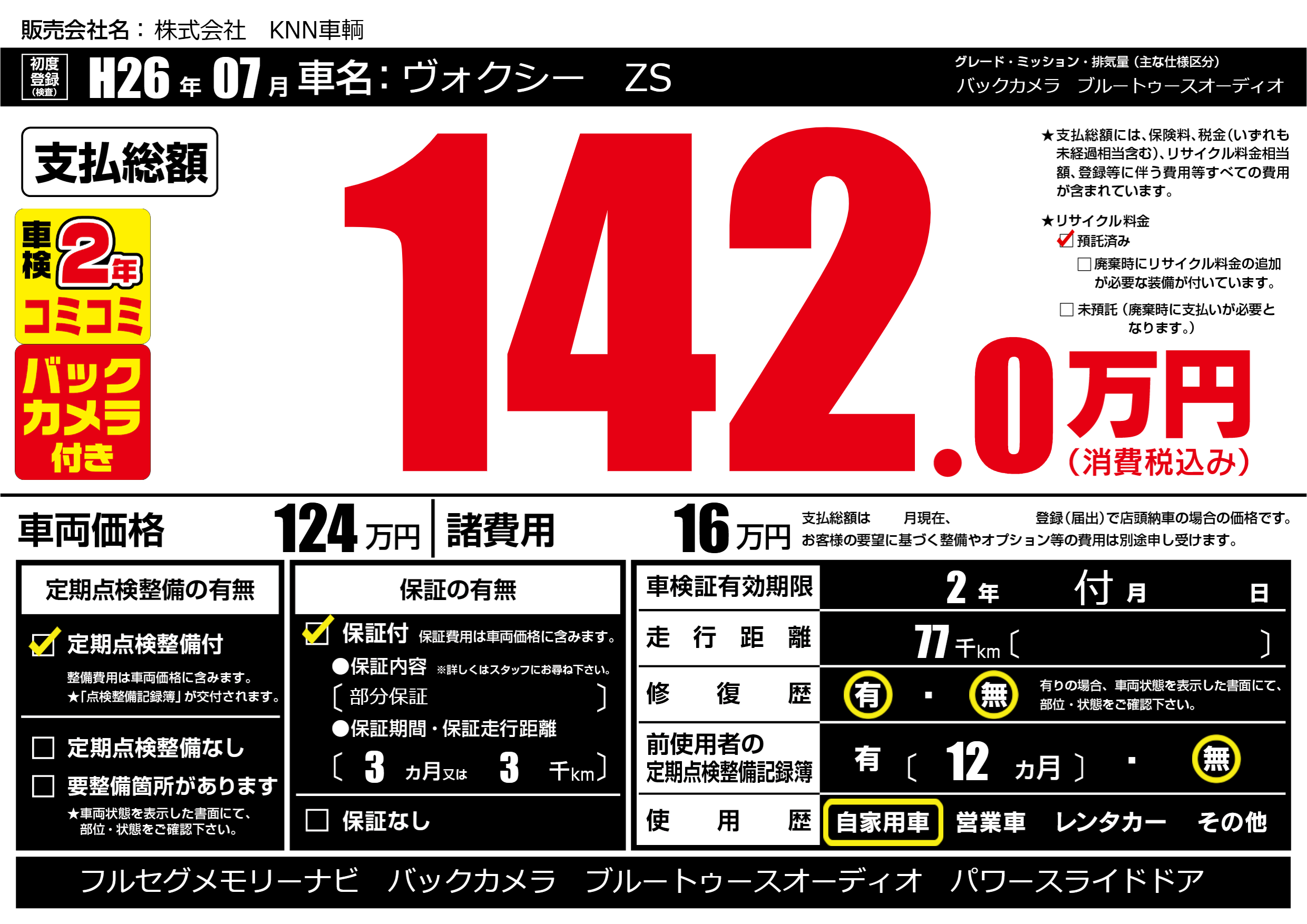 | 走行キロ | 7.7万km | 初年度登録 | H26年07月 |