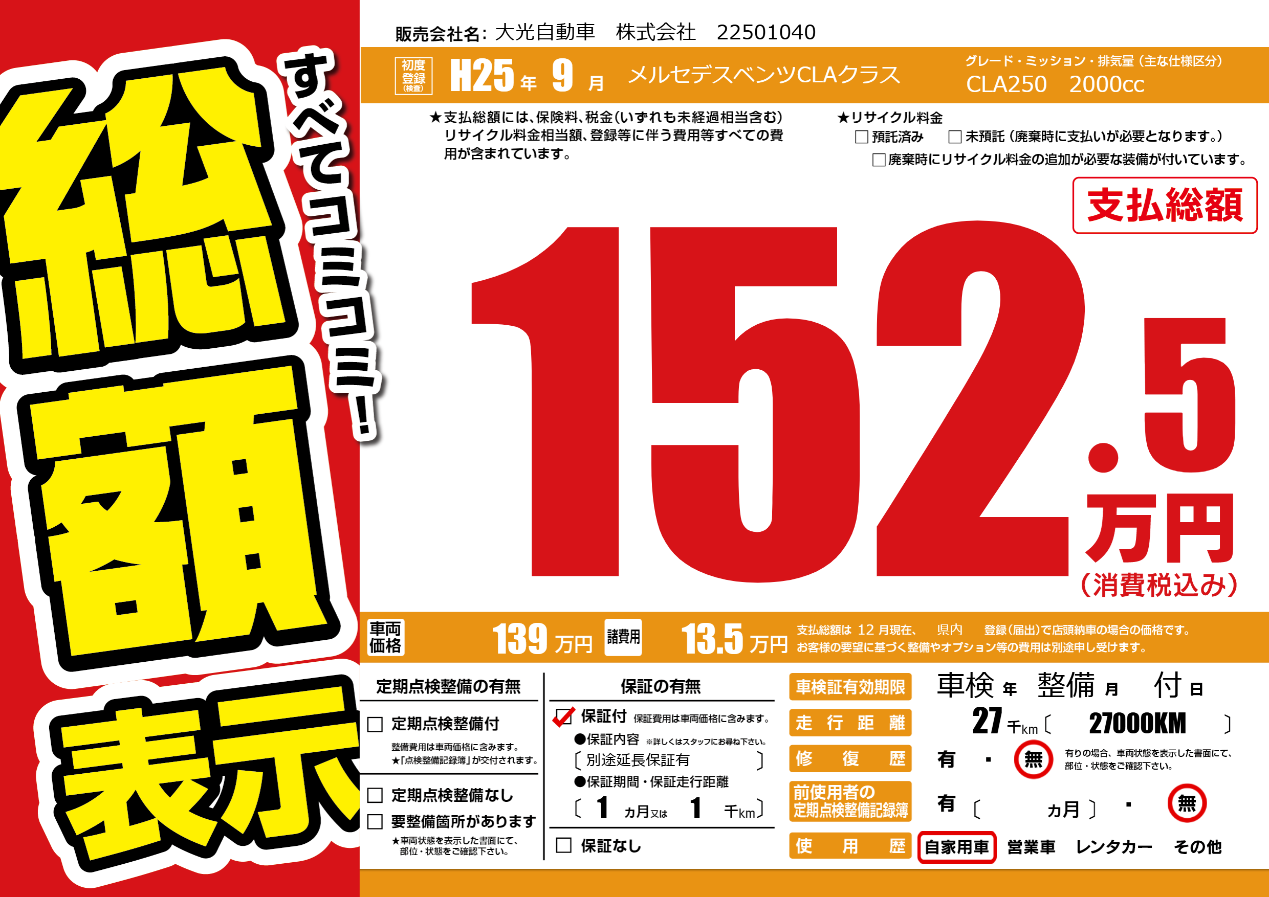 | 車名 | メルセデスベンツCLAクラス | グレード ミッション 排気量 |