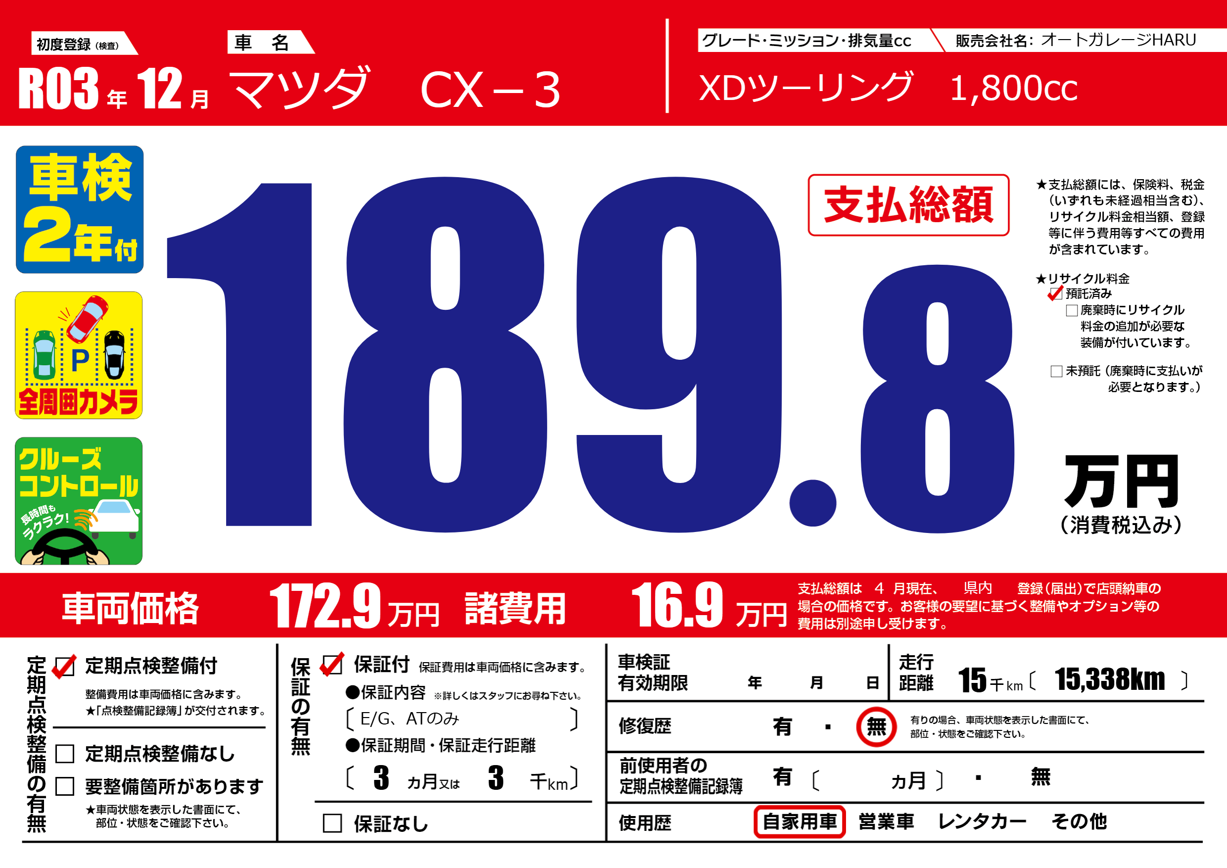 | 車名 | マツダ CX-3 | グレード ミッション 排気量 |