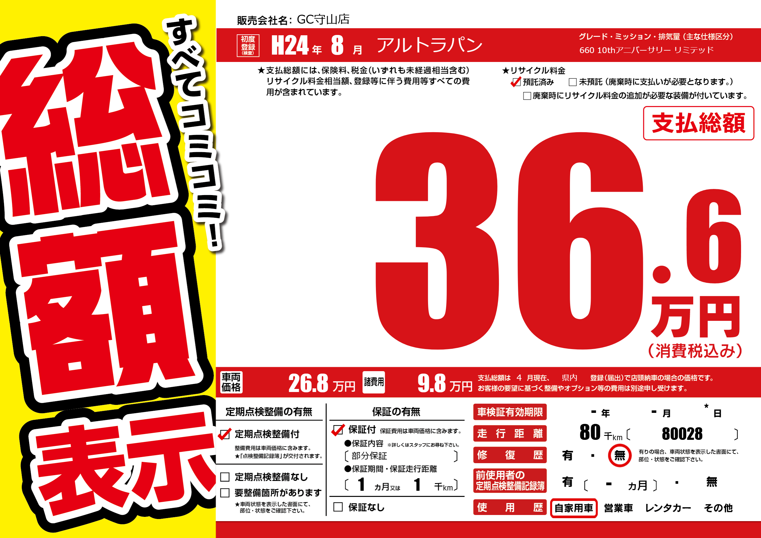 | 車名 | アルトラパン | グレード ミッション 排気量 |