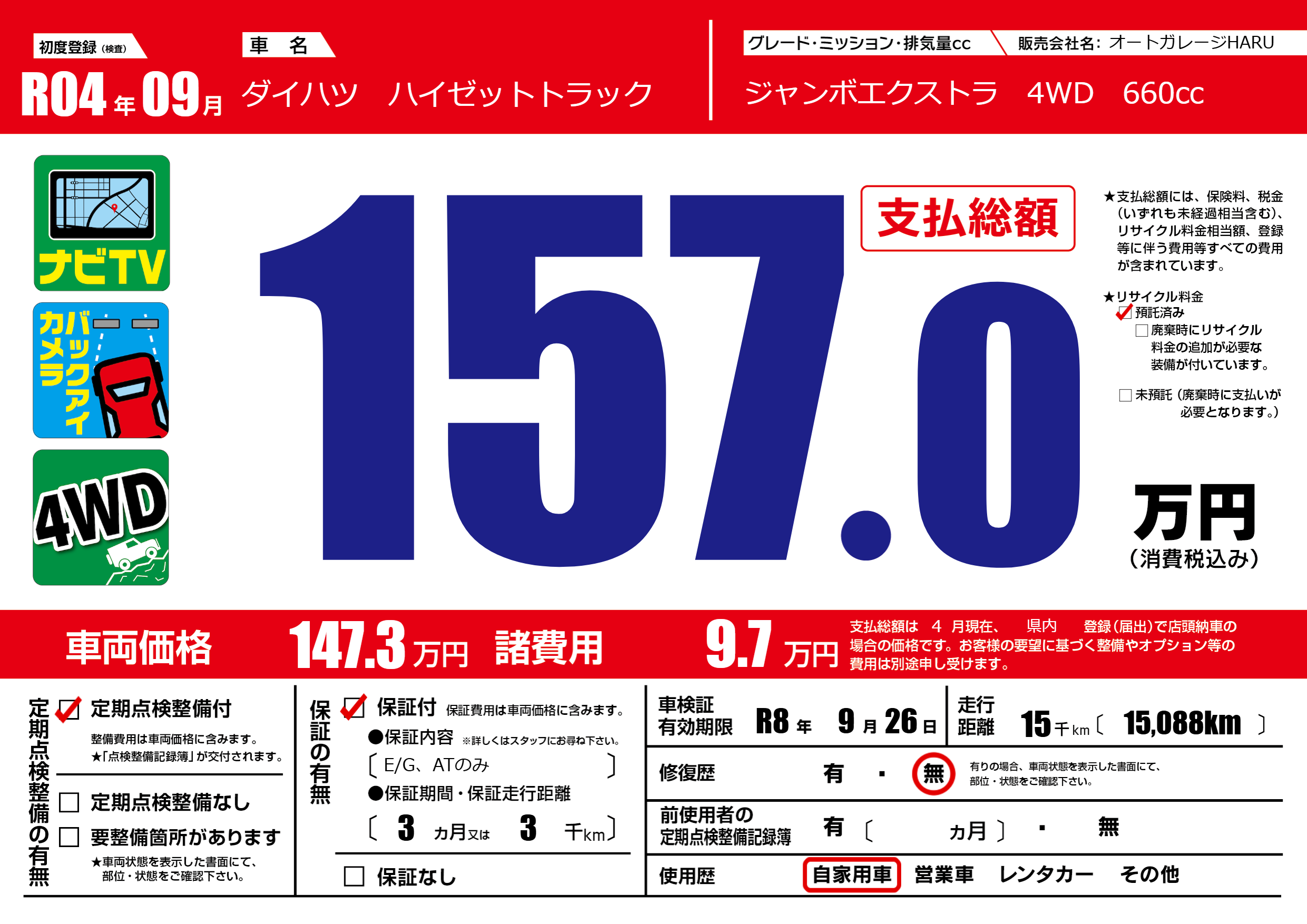 | 走行キロ | 1.5万km | 初年度登録 | R04年09月 |