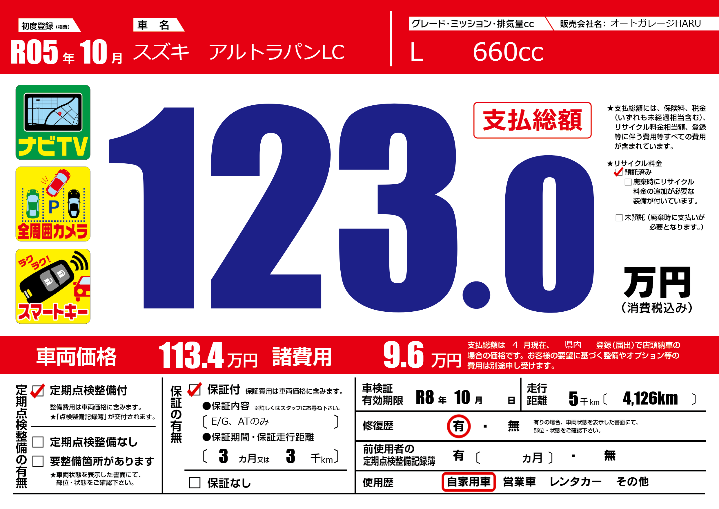 | 走行キロ | 0.5万km | 初年度登録 | R05年10月 |