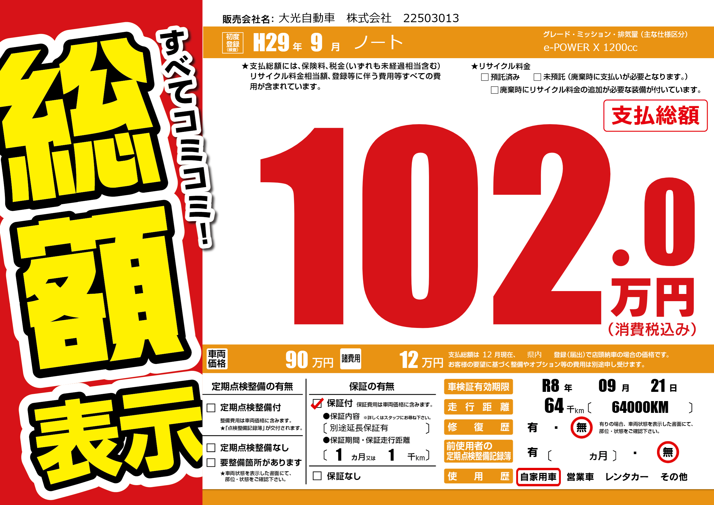 保証付き 保証内容(別途延長保証有) 1ヶ月または(1)千kmまで |