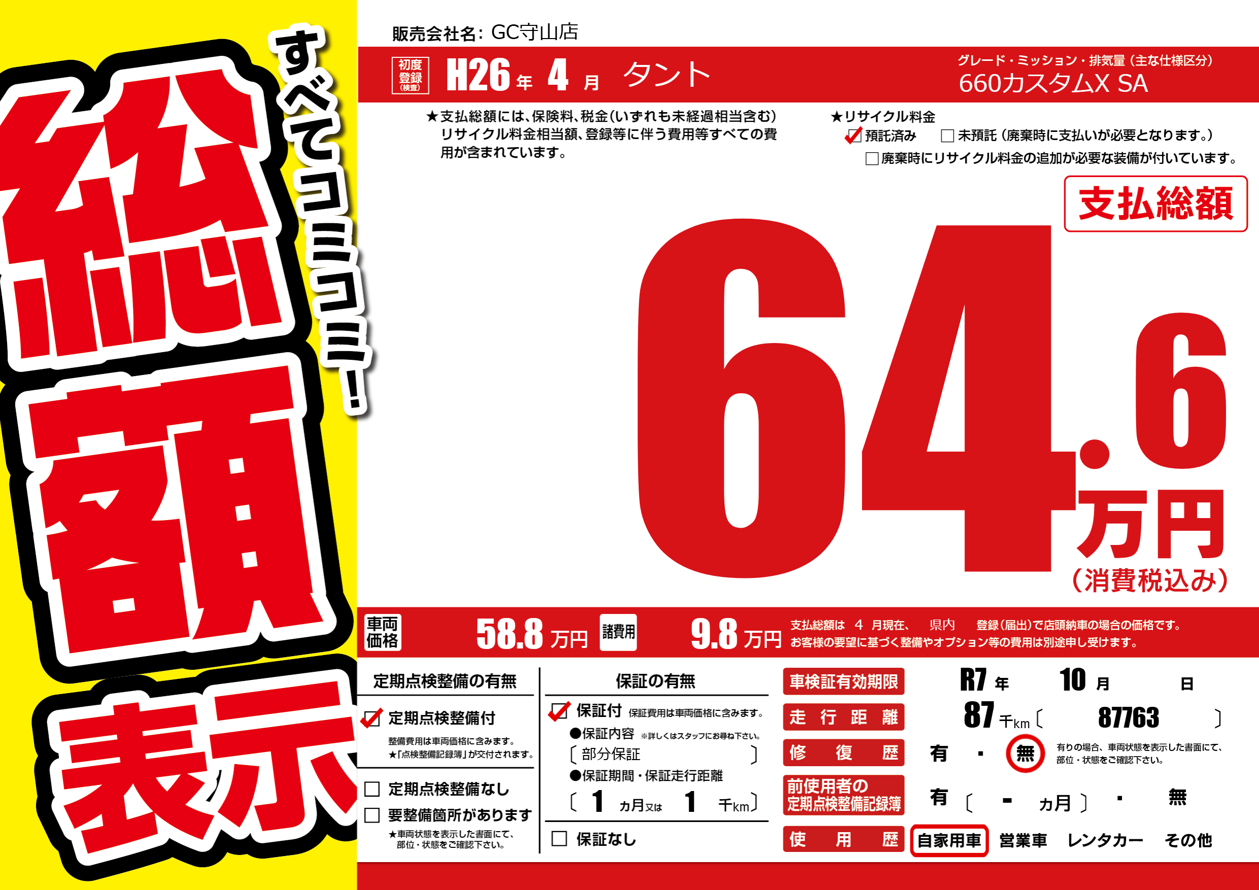 | 走行キロ | 8.7万km | 初年度登録 | H26年4月 |