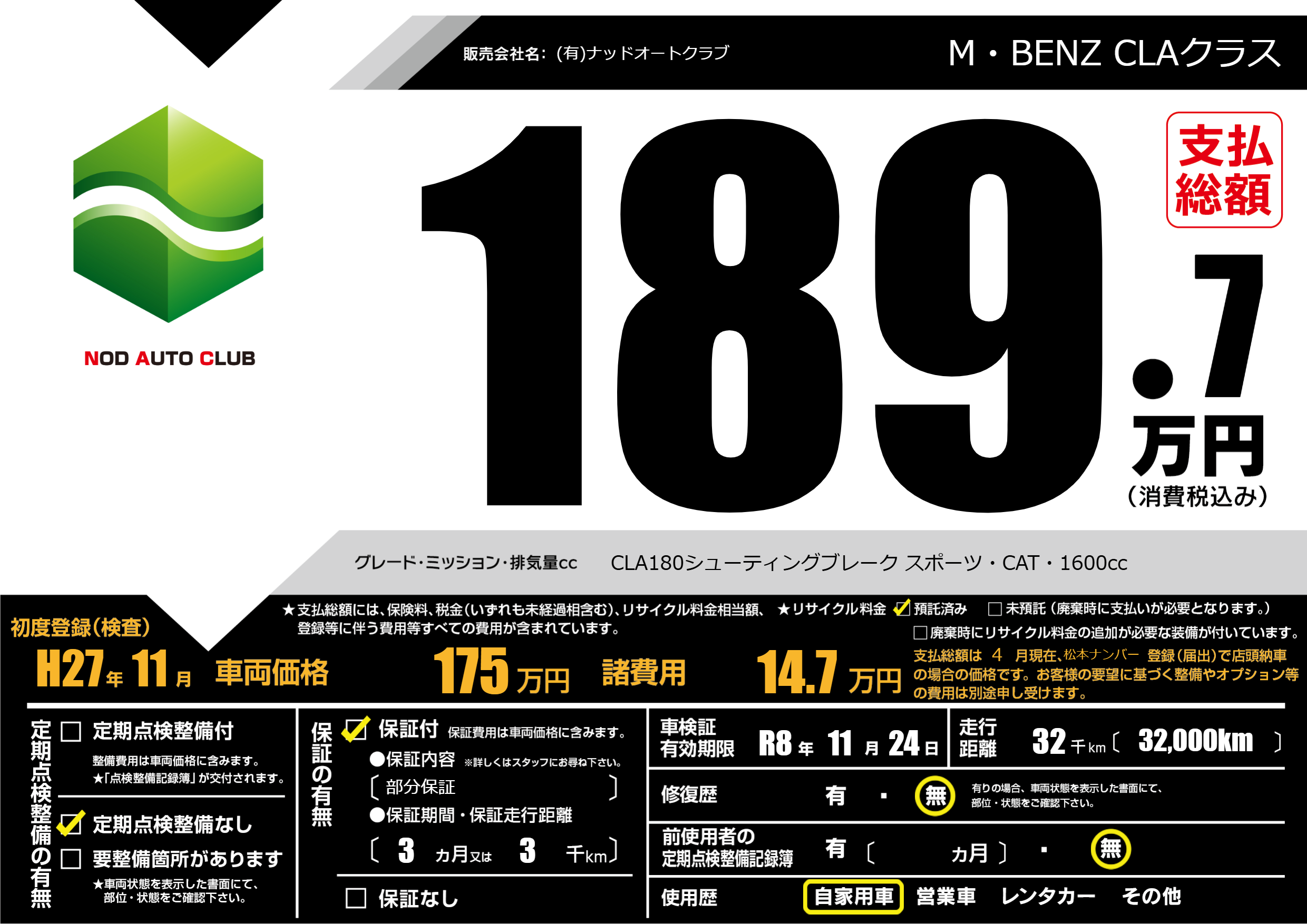 | 車名 | M・BENZ CLAクラス | グレード ミッション 排気量 |
