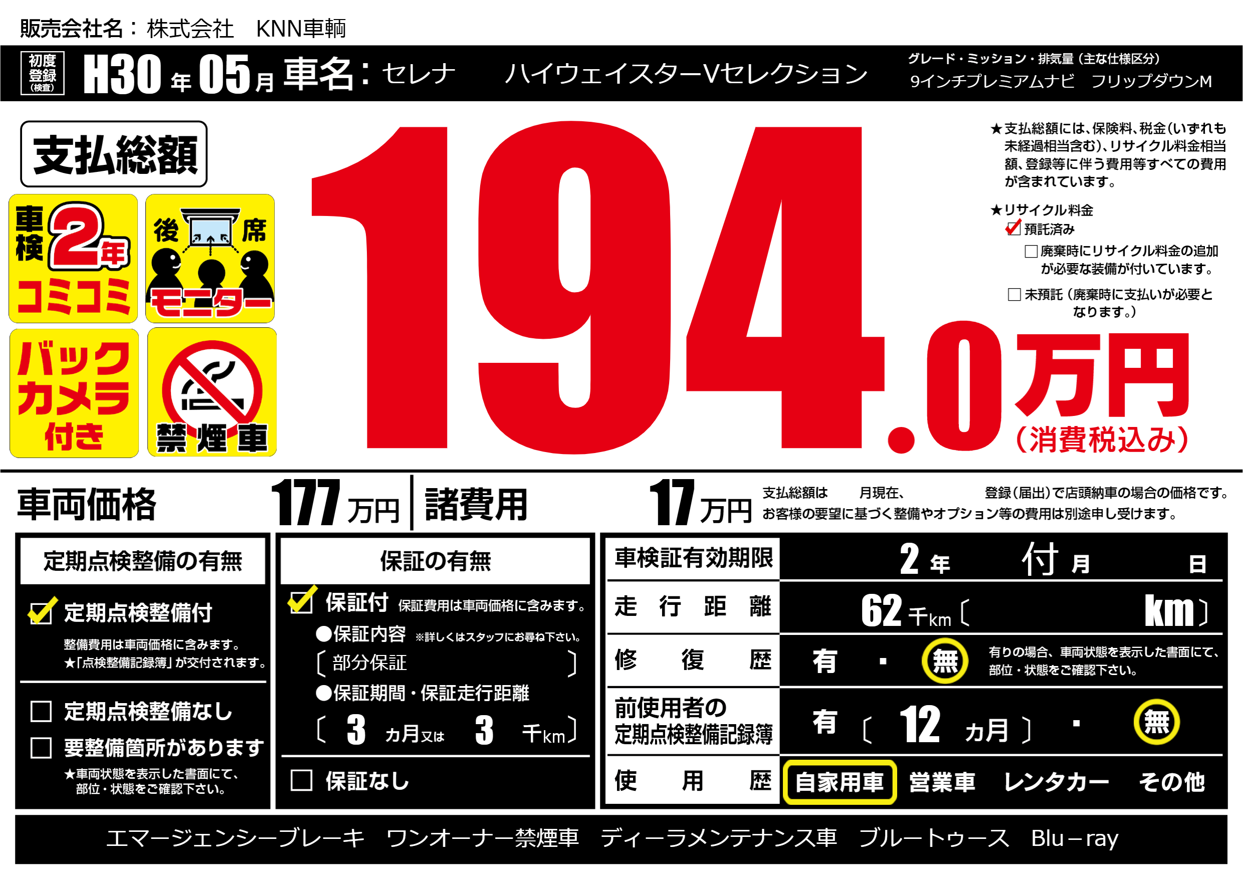 | 車名 | セレナ ハイウェイスターVセレクション | グレード ミッション 排気量 |