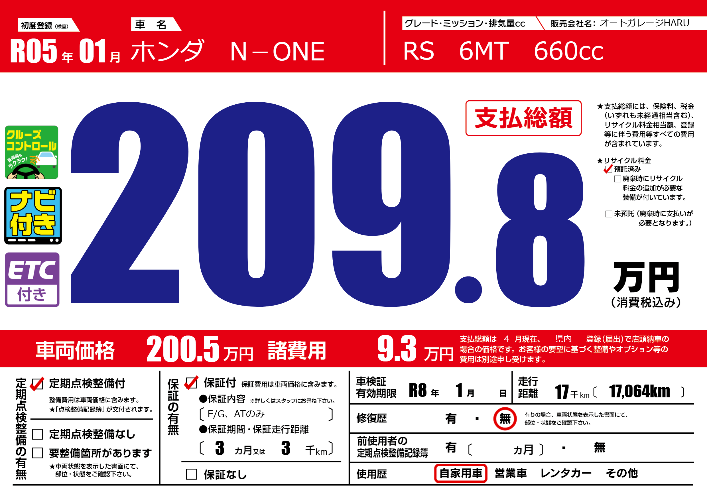 | 車名 | ホンダ N-ONE | グレード ミッション 排気量 |
