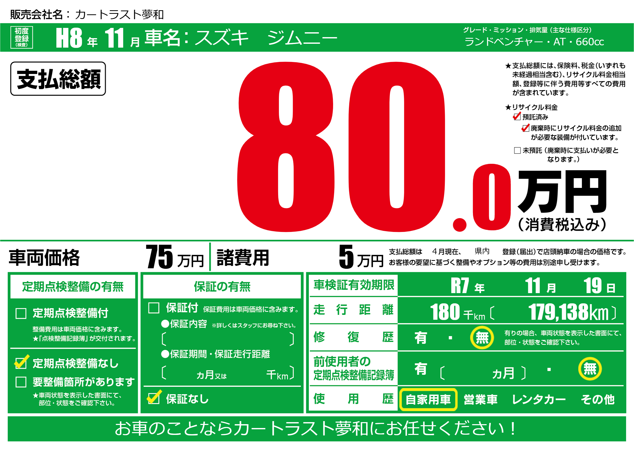 | 走行キロ | 18万km | 初年度登録 | H8年11月 |