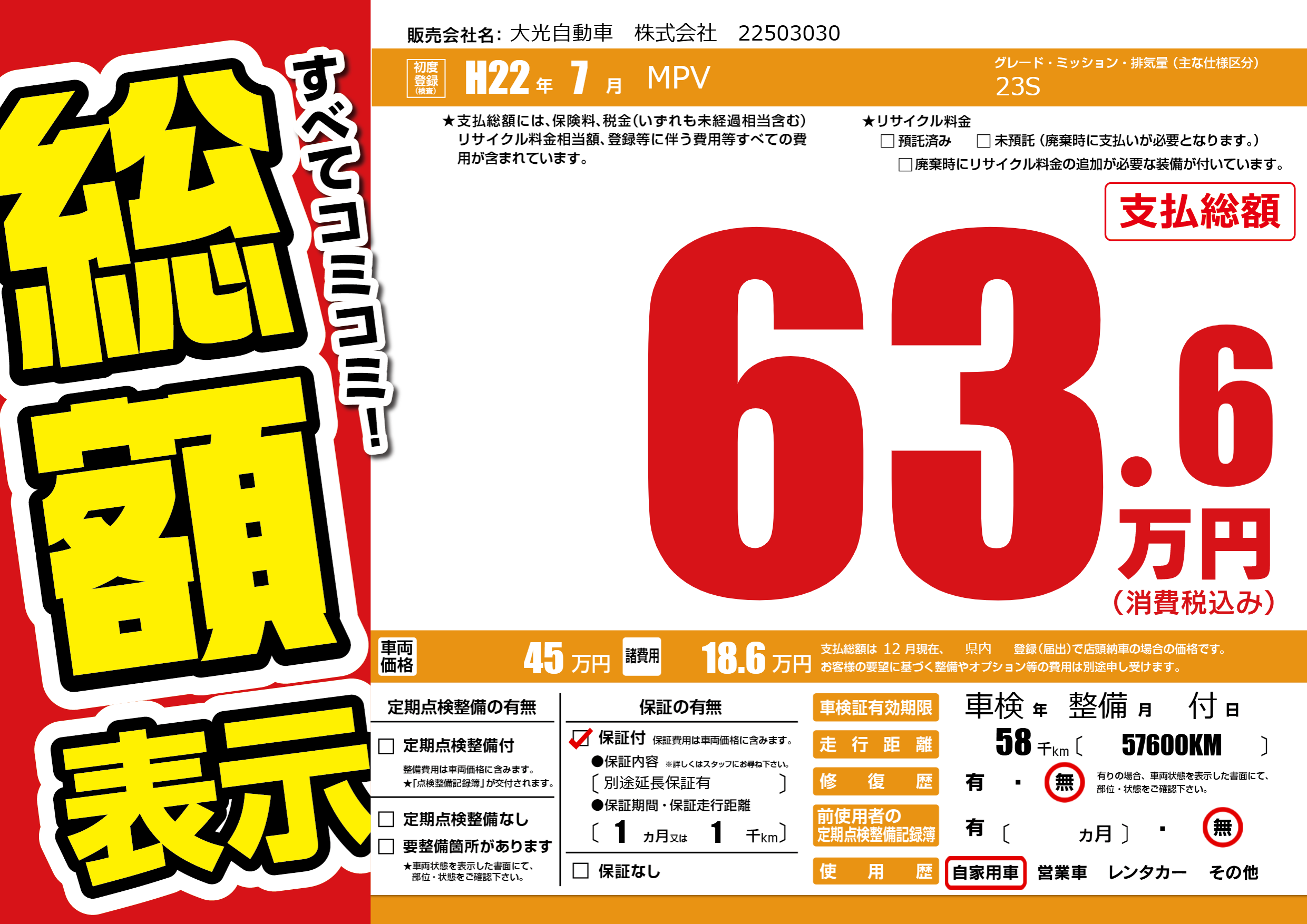 | 走行キロ | 5.8万km | 初年度登録 | H22年7月 |