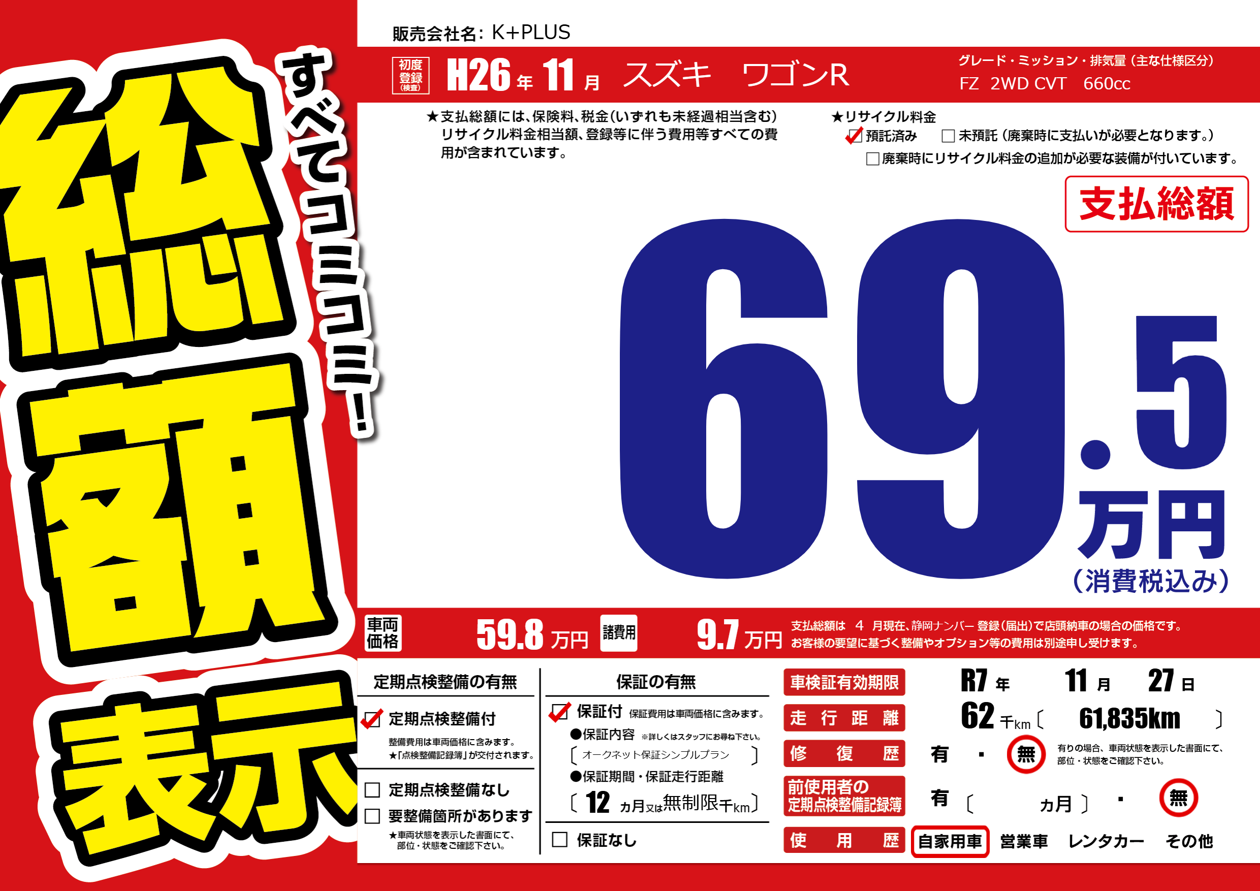 | 車名 | スズキ ワゴンR | グレード ミッション 排気量 |