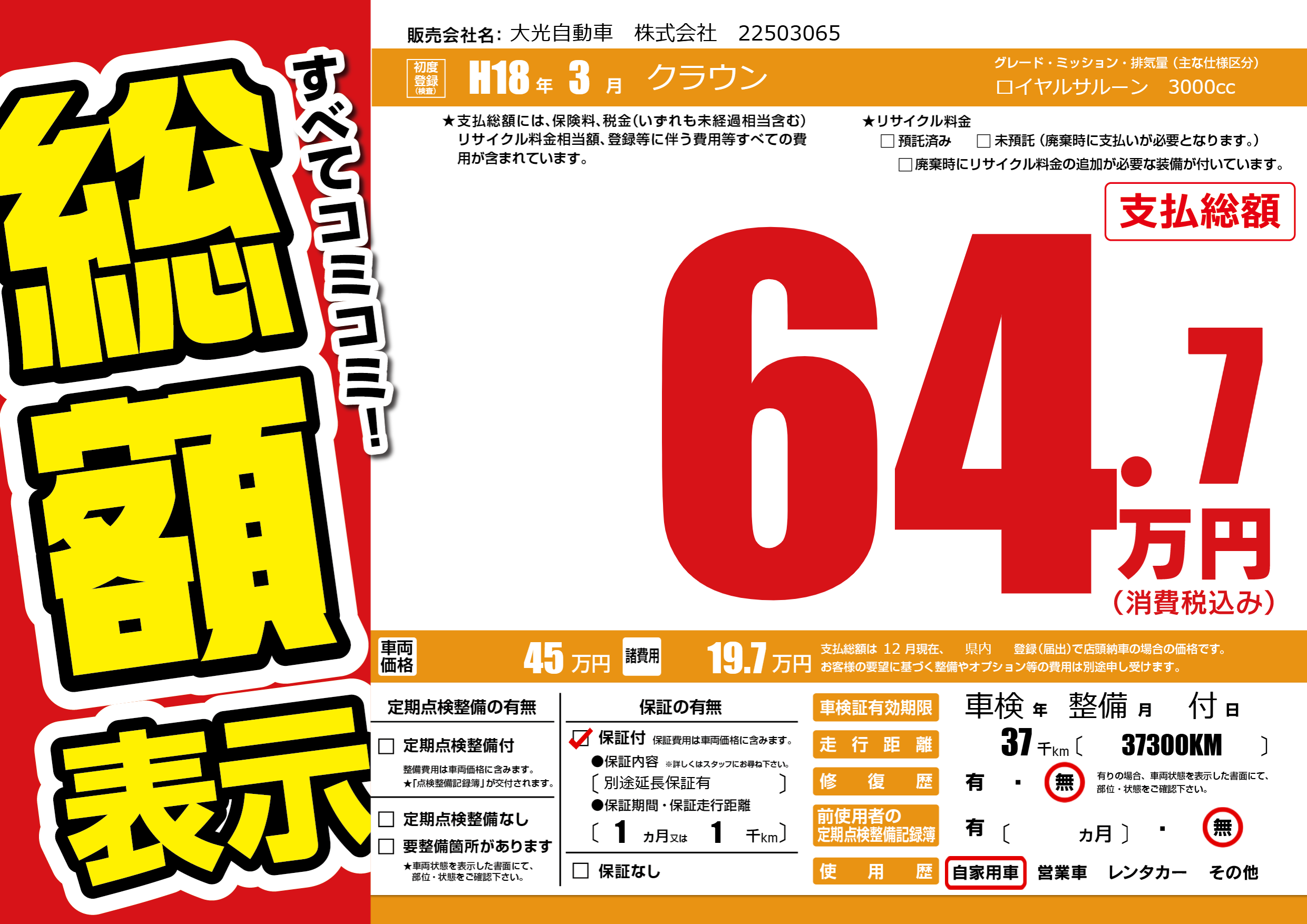 | 車名 | クラウン | グレード ミッション 排気量 |