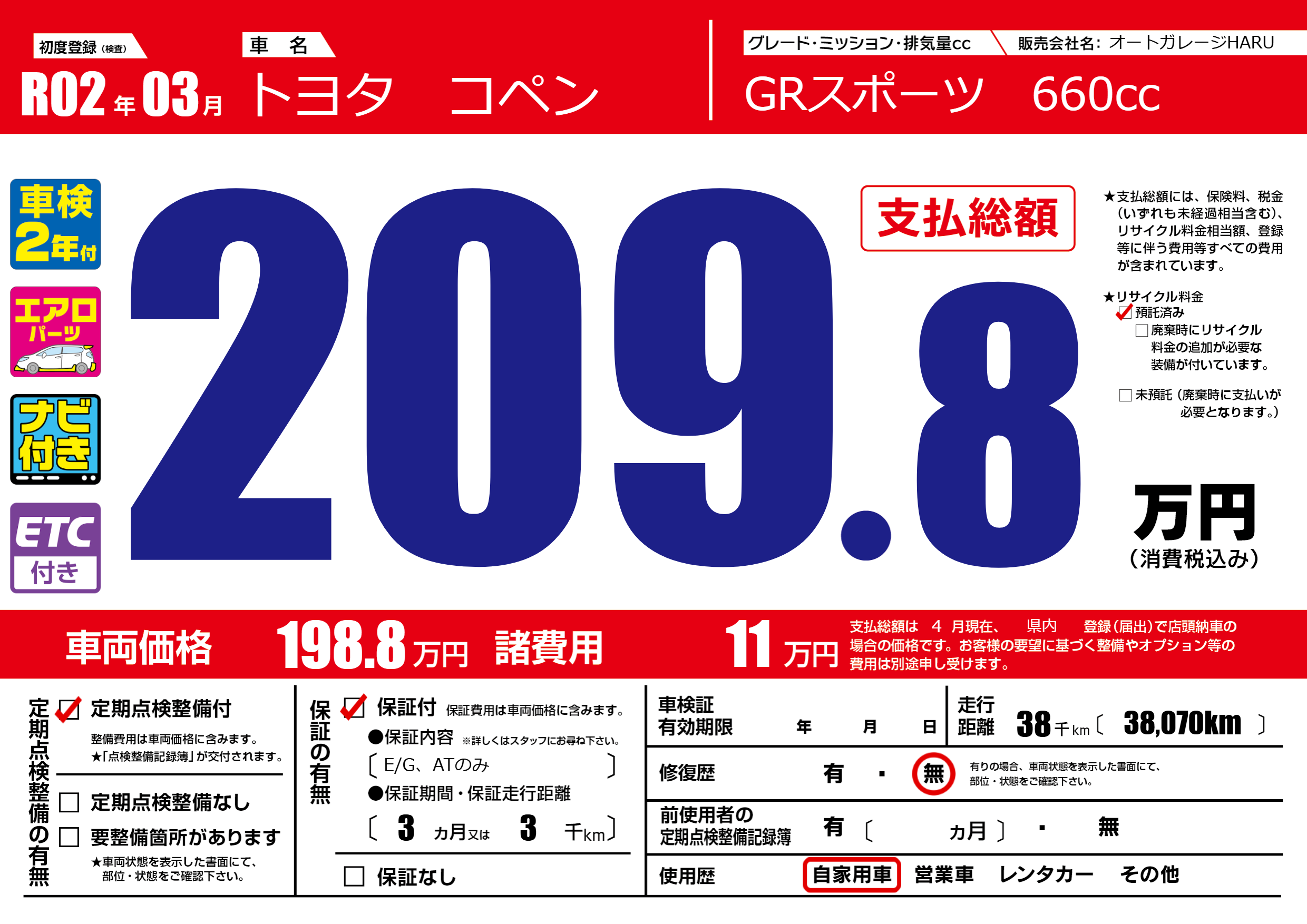| 走行キロ | 3.8万km | 初年度登録 | R02年03月 |