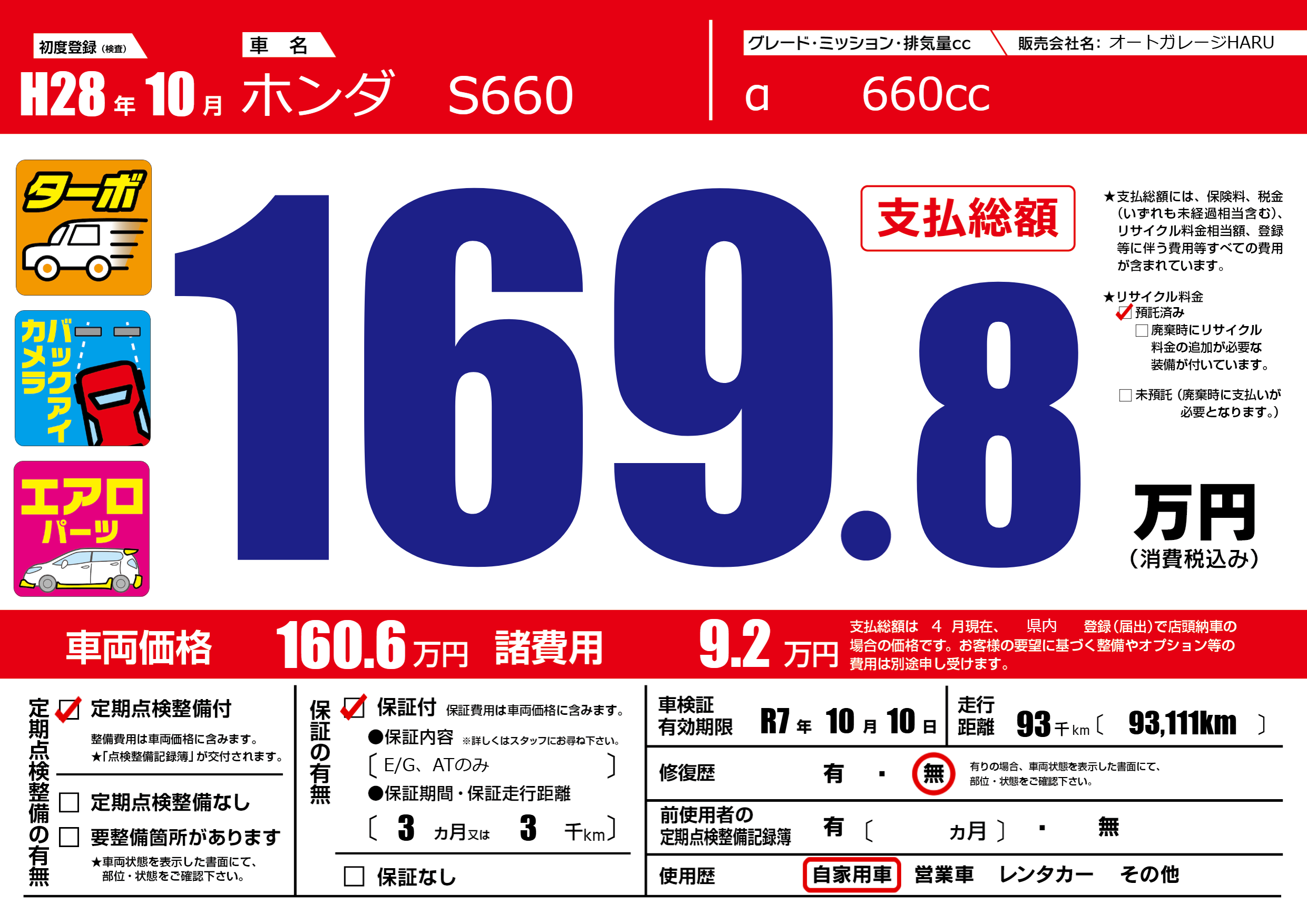 | 車名 | ホンダ S660 | グレード ミッション 排気量 |