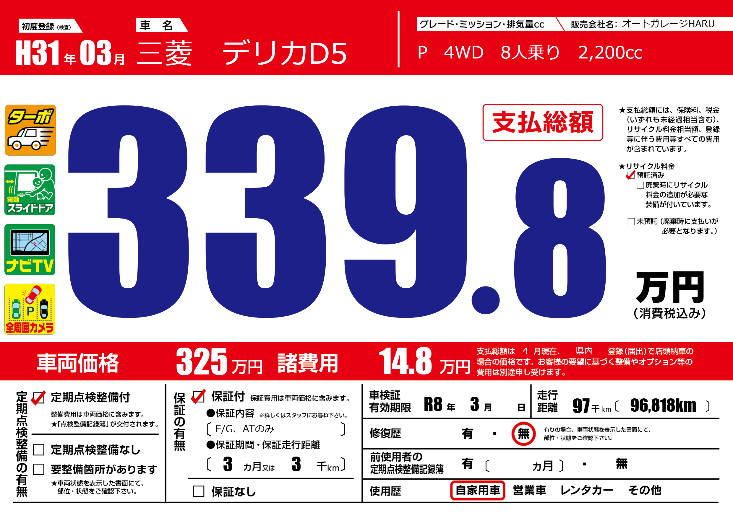 | 車名 | 三菱 デリカD5 | グレード ミッション 排気量 |