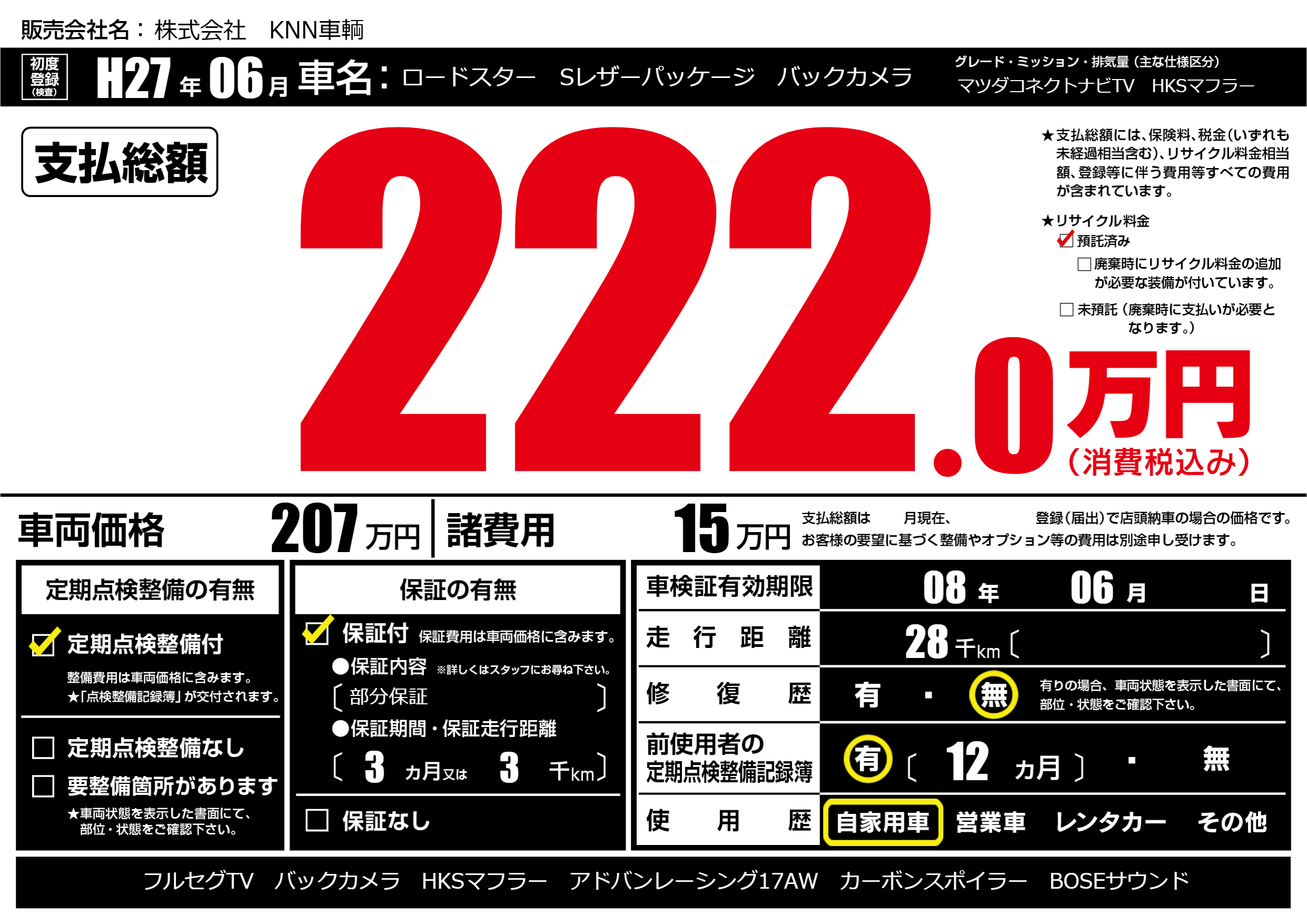 | 車名 | ロードスター Sレザーパッケージ バックカメラ | グレード ミッション 排気量 |