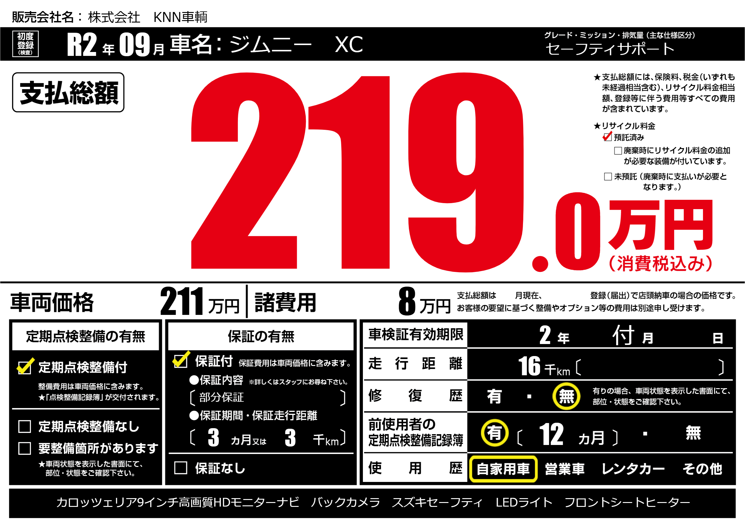 | 車名 | ジムニー XC | グレード ミッション 排気量 |