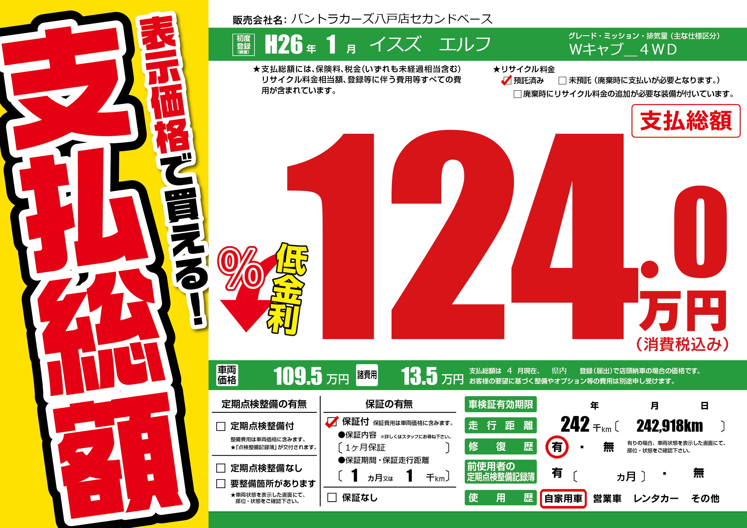 | 走行キロ | 24.2万km | 初年度登録 | H26年1月 |