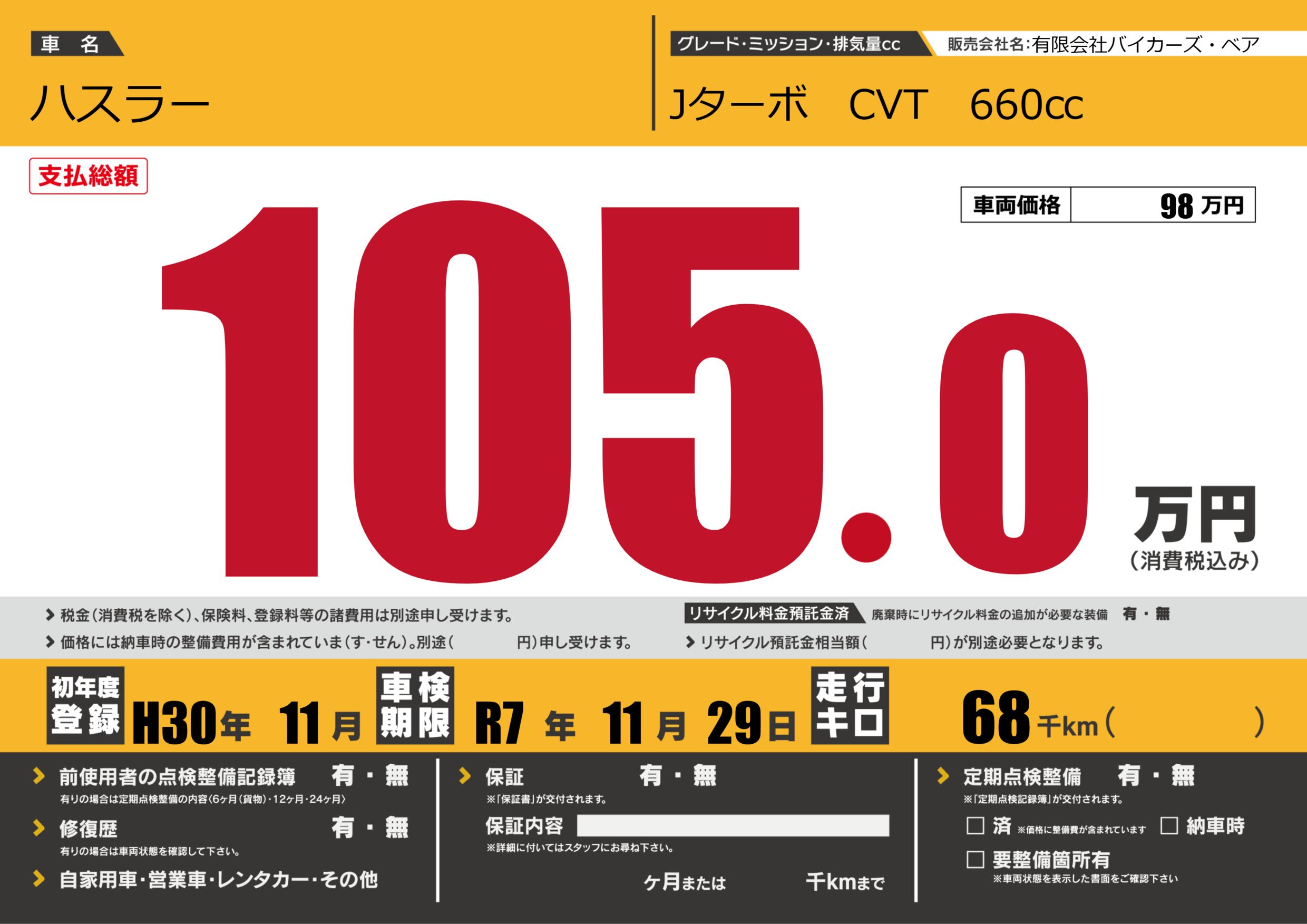 | 走行キロ | 6.8万km | 初年度登録 | H30年11月 |