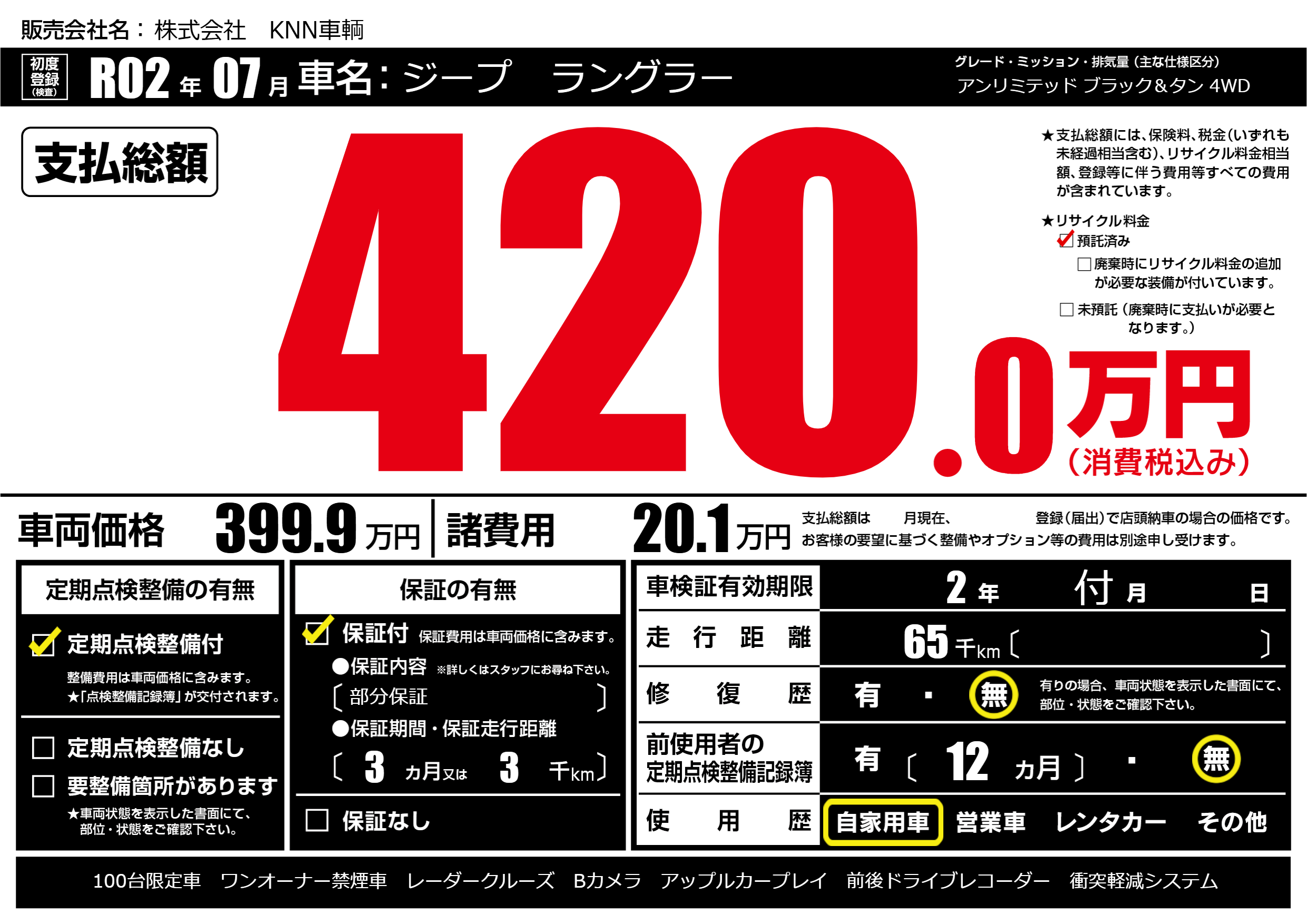 | 車名 | ジープ ラングラー | グレード ミッション 排気量 |