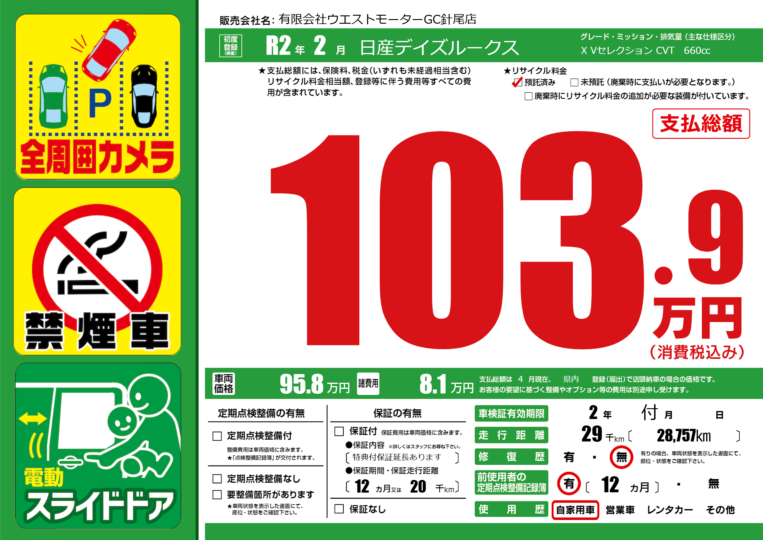 | 車名 | 日産デイズルークス | グレード ミッション 排気量 |