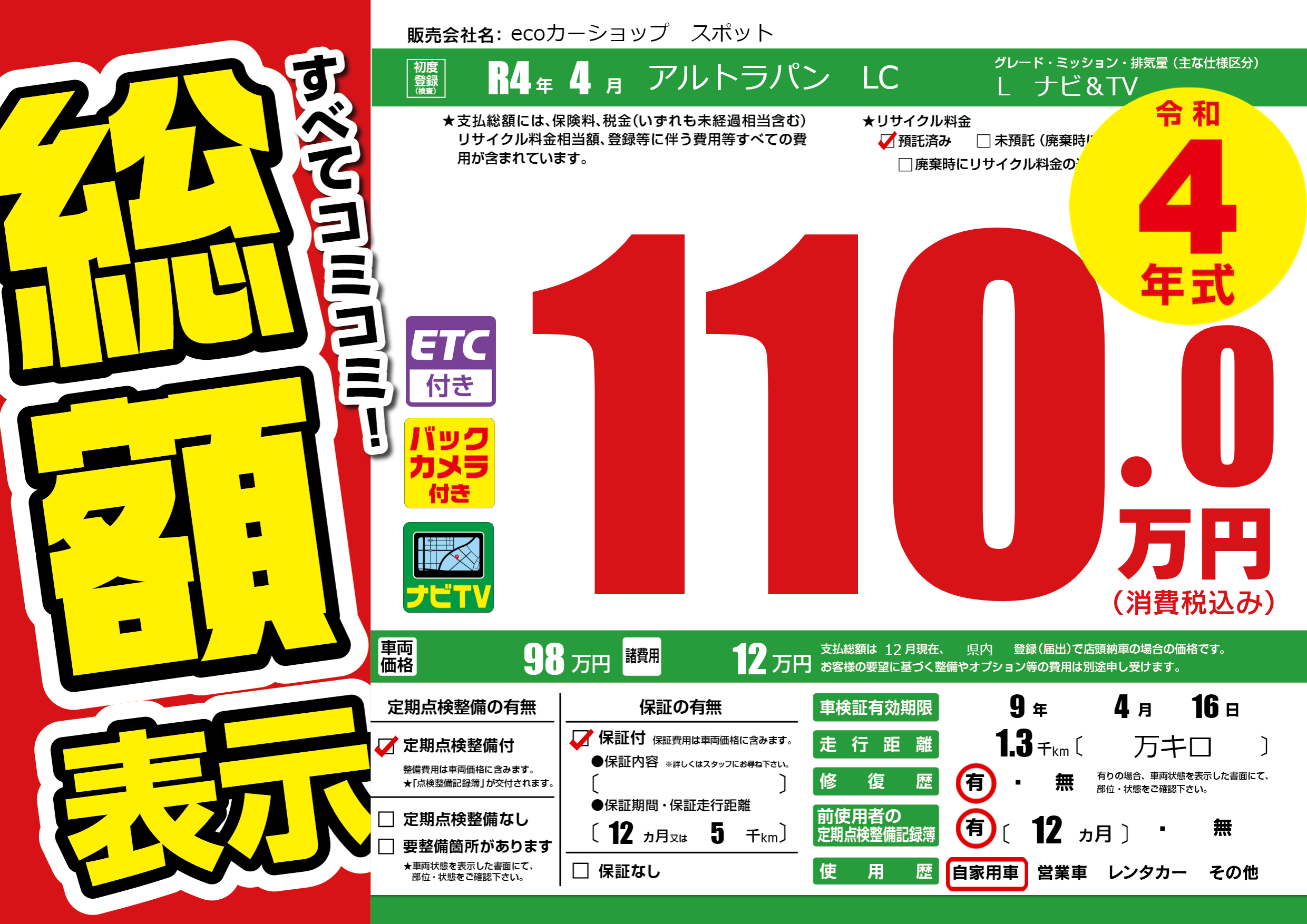 なし | 車検制限 | 9年4月16月 |