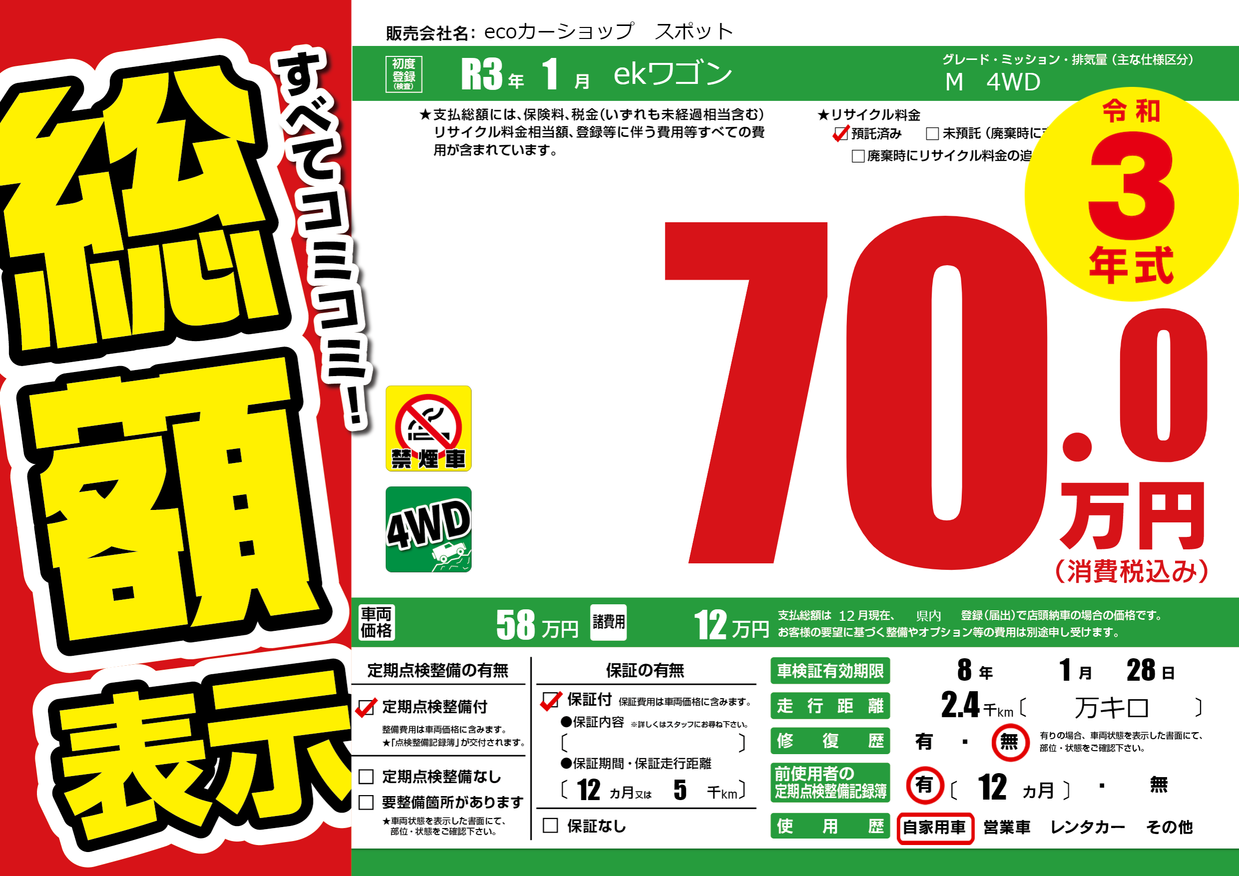 | 車名 | ekワゴン | グレード ミッション 排気量 |
