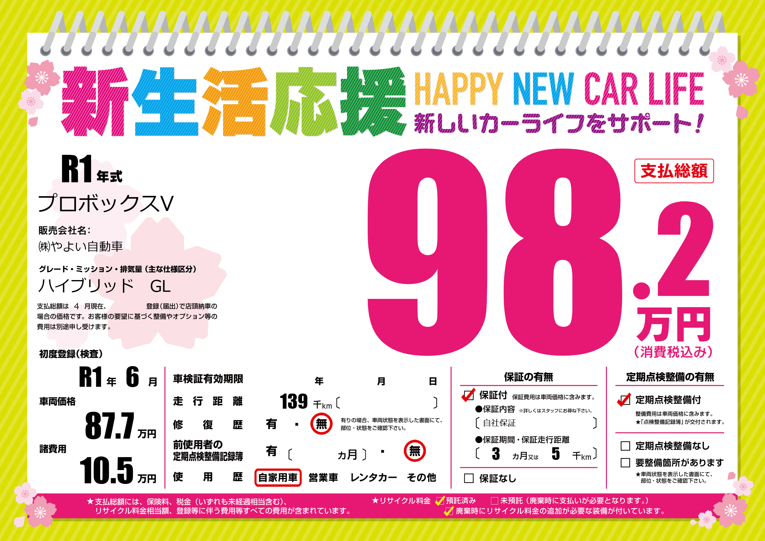 | 車名 | プロボックスV | グレード ミッション 排気量 |