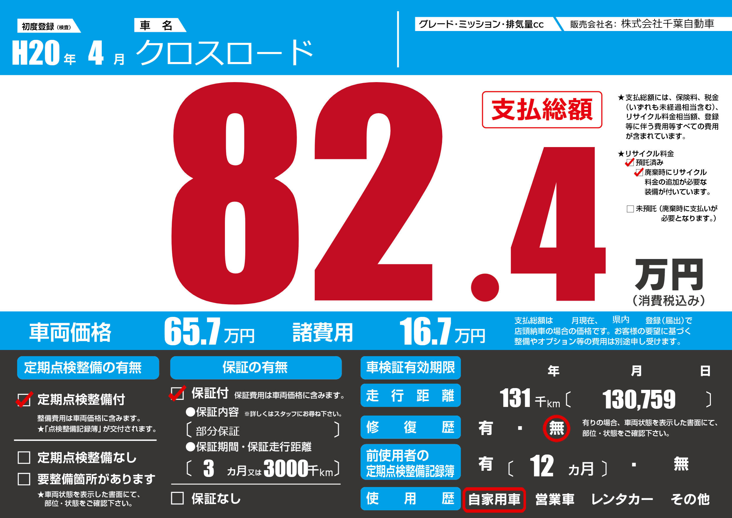 | 走行キロ | 13.1万km | 初年度登録 | H20年4月 |