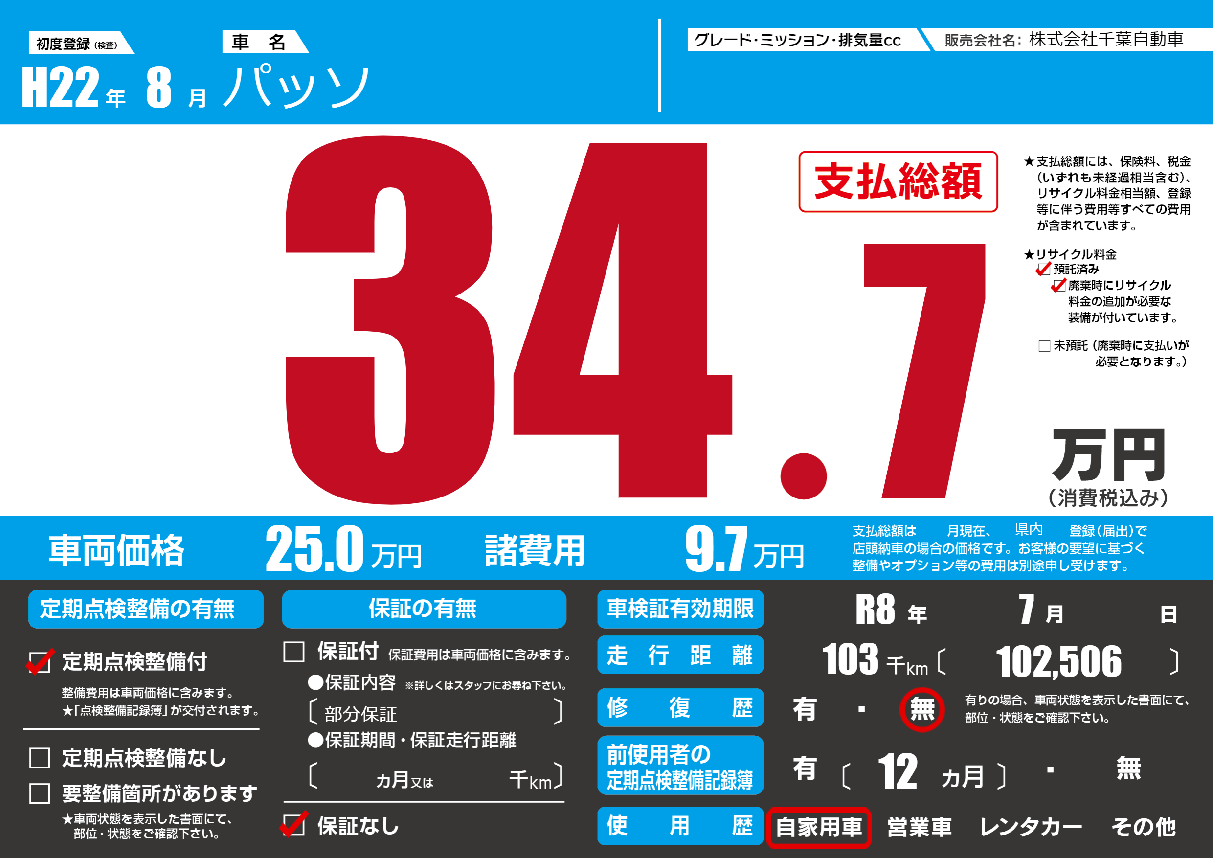 | 車名 | パッソ | グレード ミッション 排気量 |