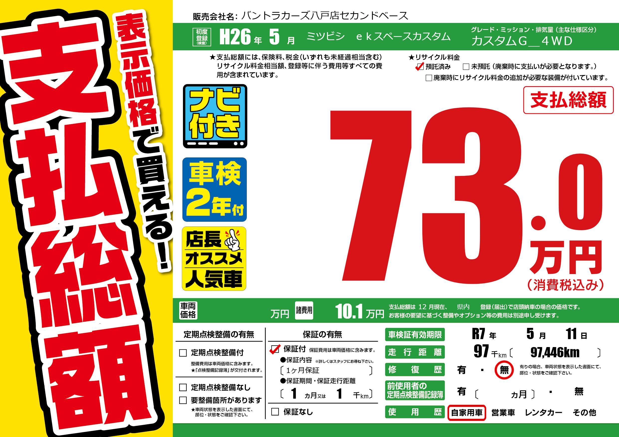 | 走行キロ | 9.7万km | 初年度登録 | H26年5月 |