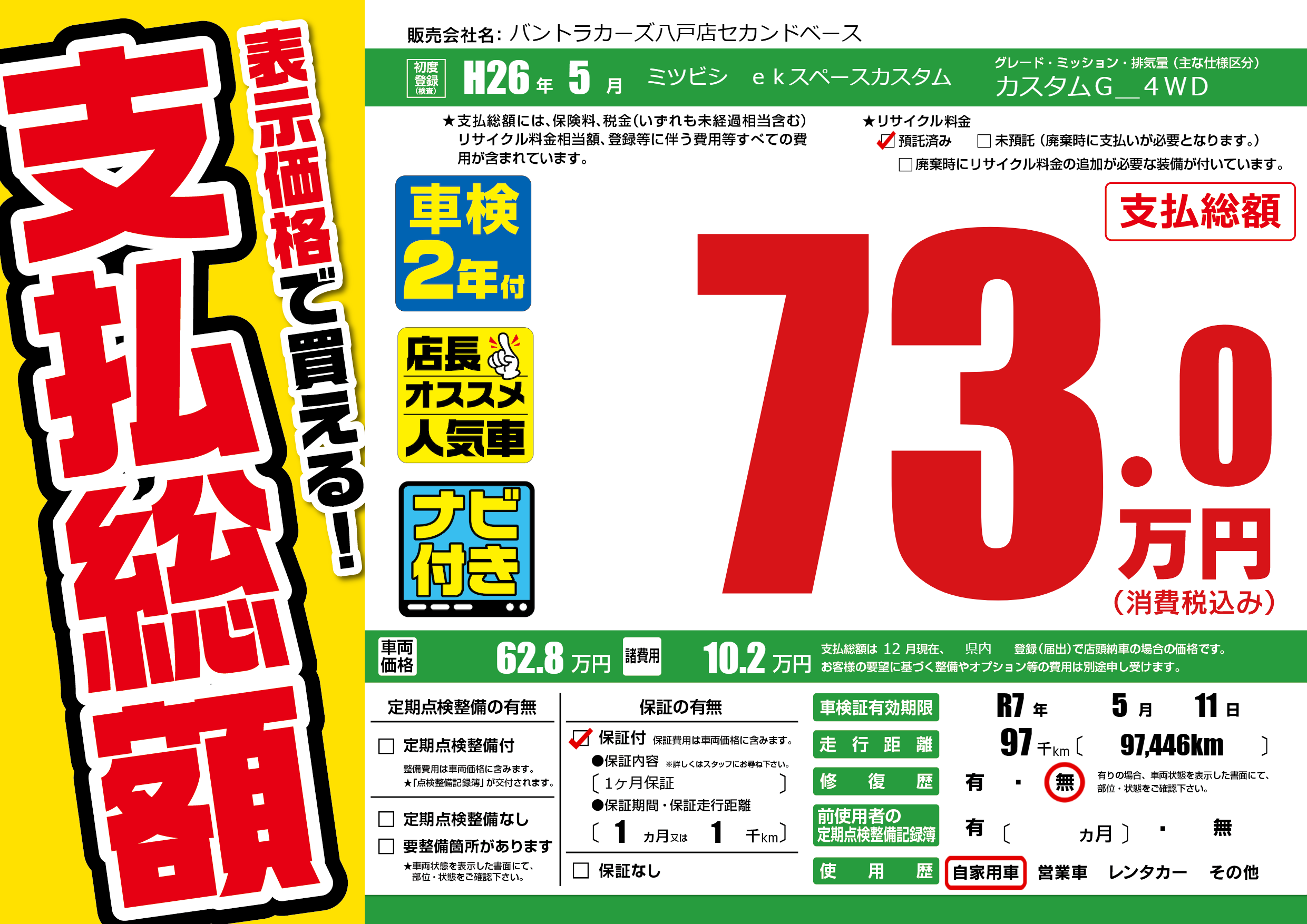 | 走行キロ | 9.7万km | 初年度登録 | H26年5月 |