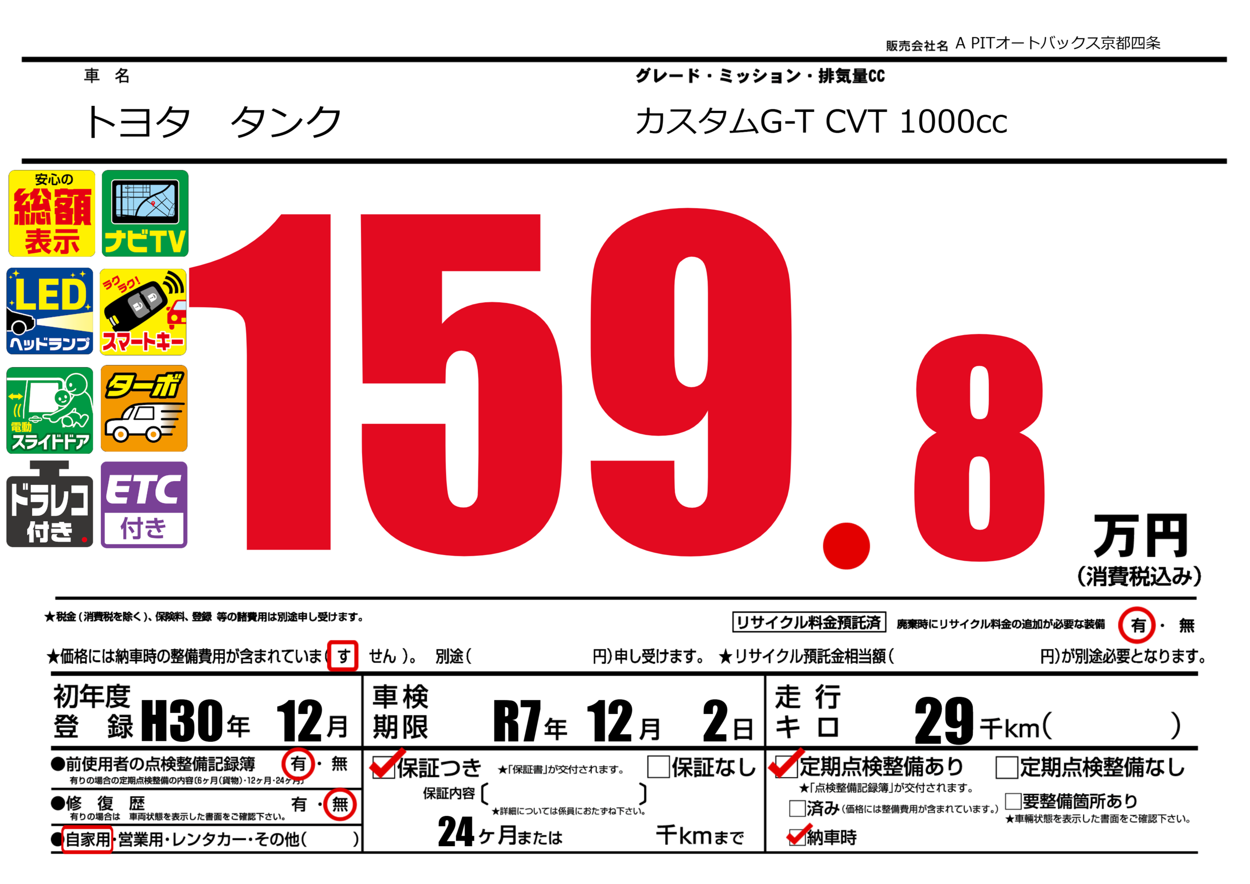 | 車名 | トヨタ タンク | グレード ミッション 排気量 |