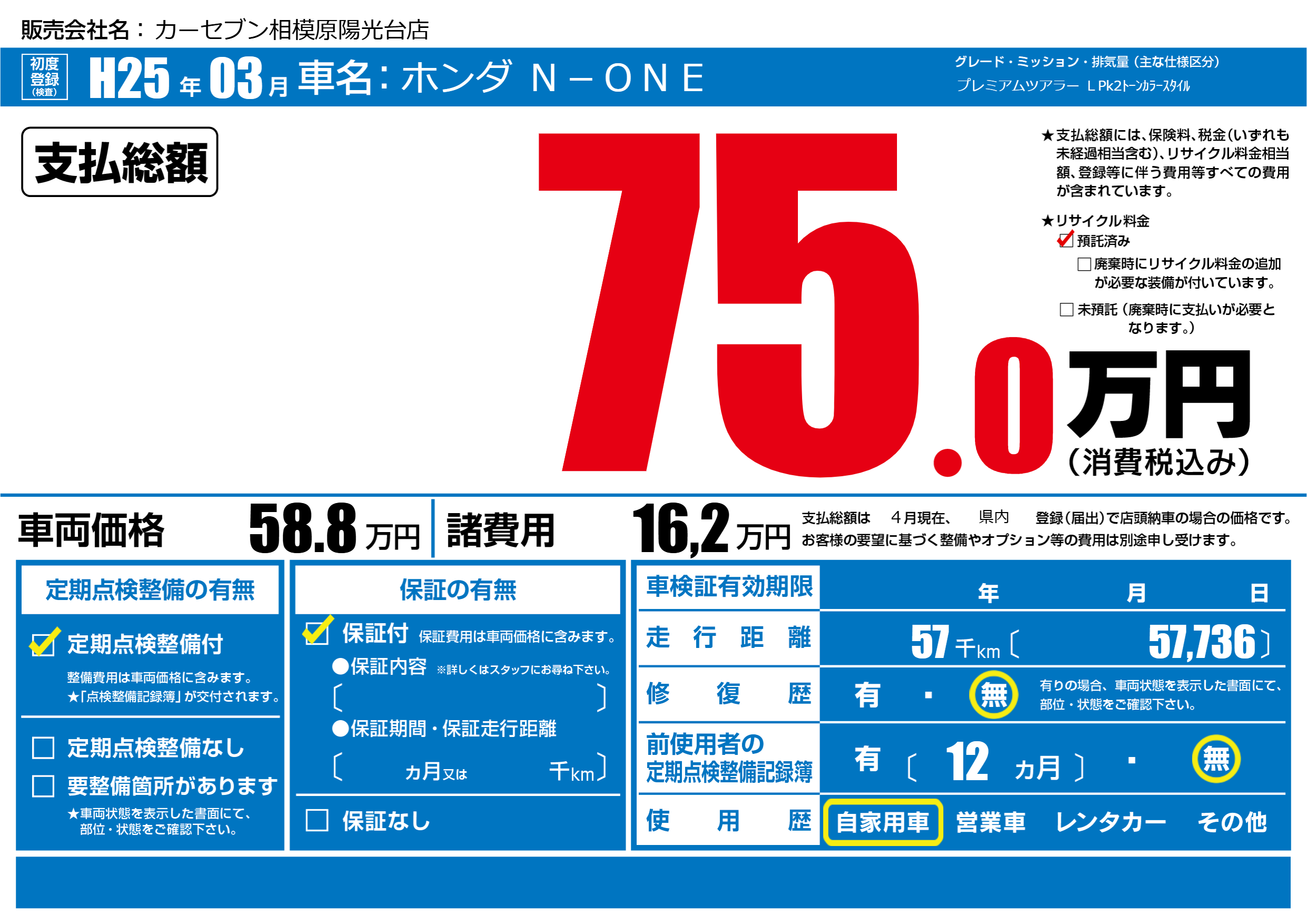 | 走行キロ | 5.7万km | 初年度登録 | H25年03月 |