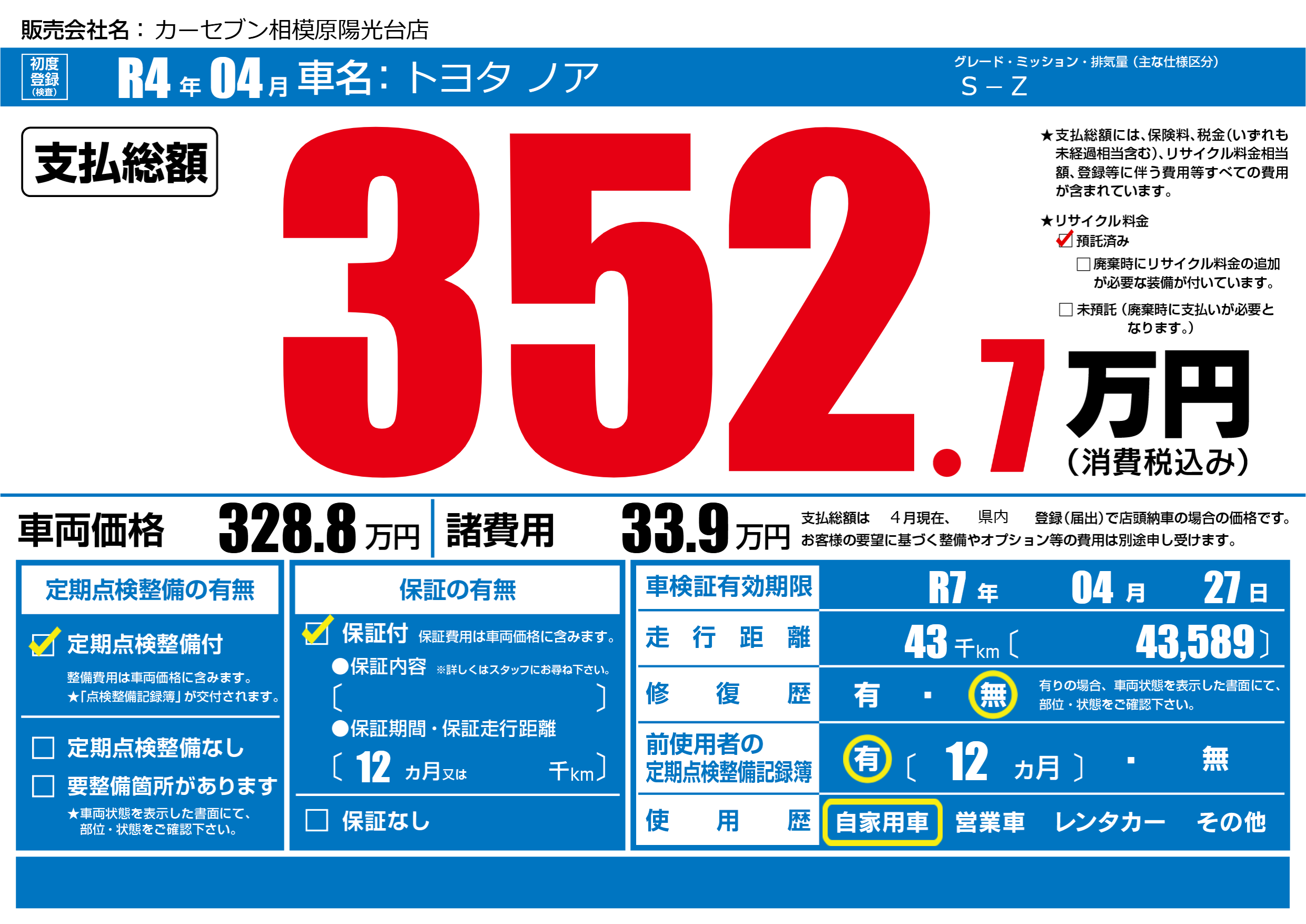 | 走行キロ | 4.3万km | 初年度登録 | R4年04月 |