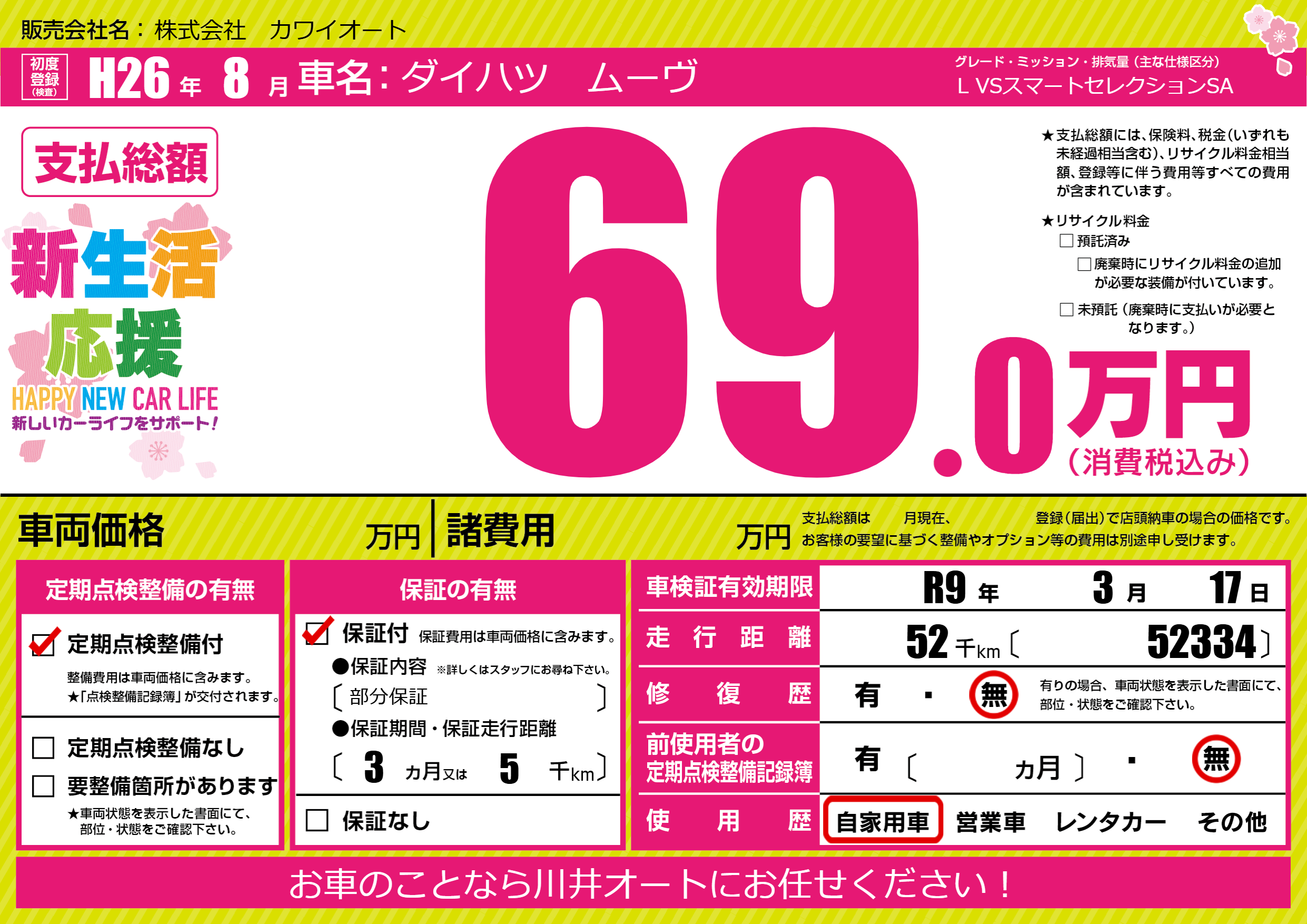 | 走行キロ | 5.2万km | 初年度登録 | H26年8月 |