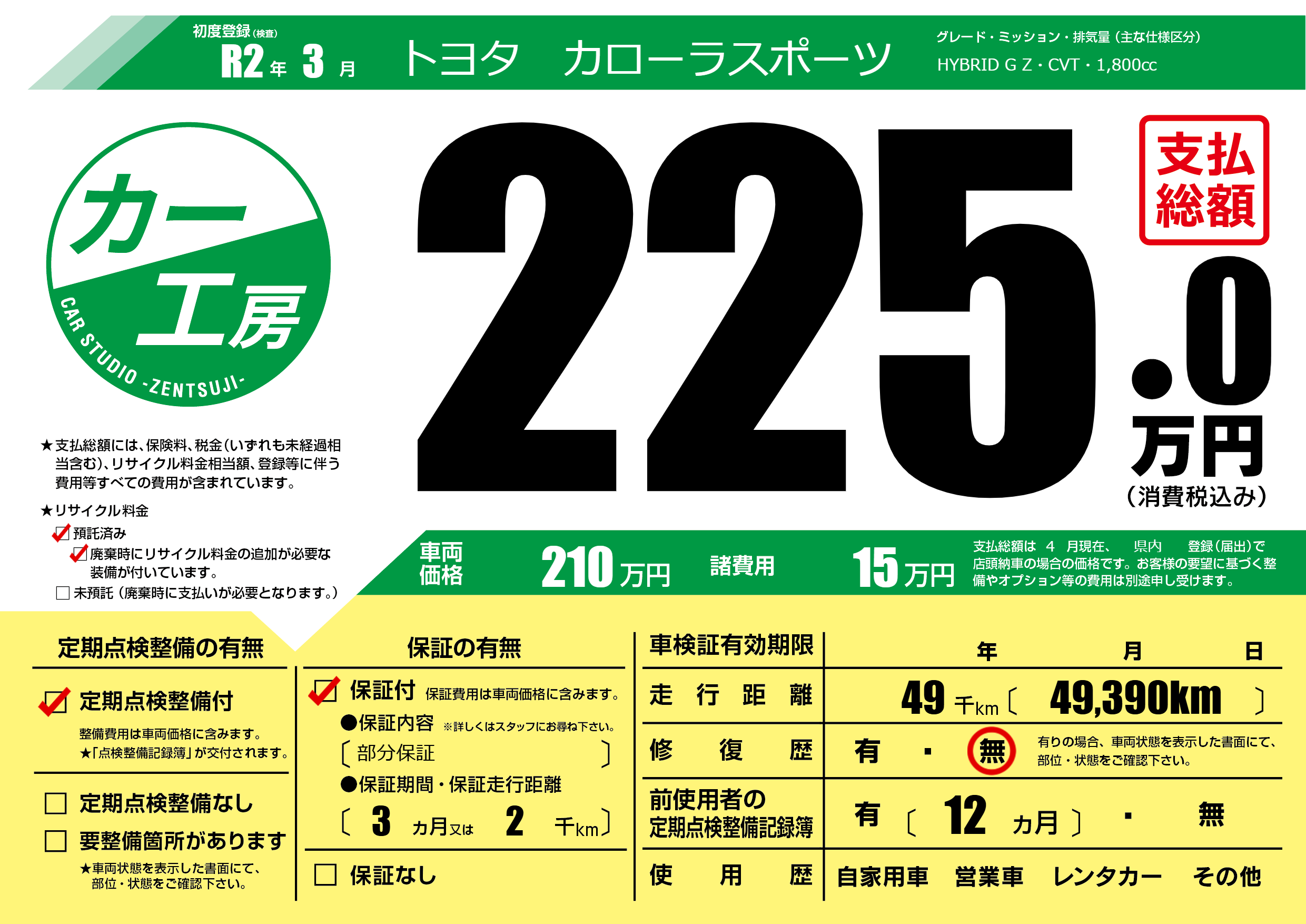 | 車名 | トヨタ カローラスポーツ | グレード ミッション 排気量 |