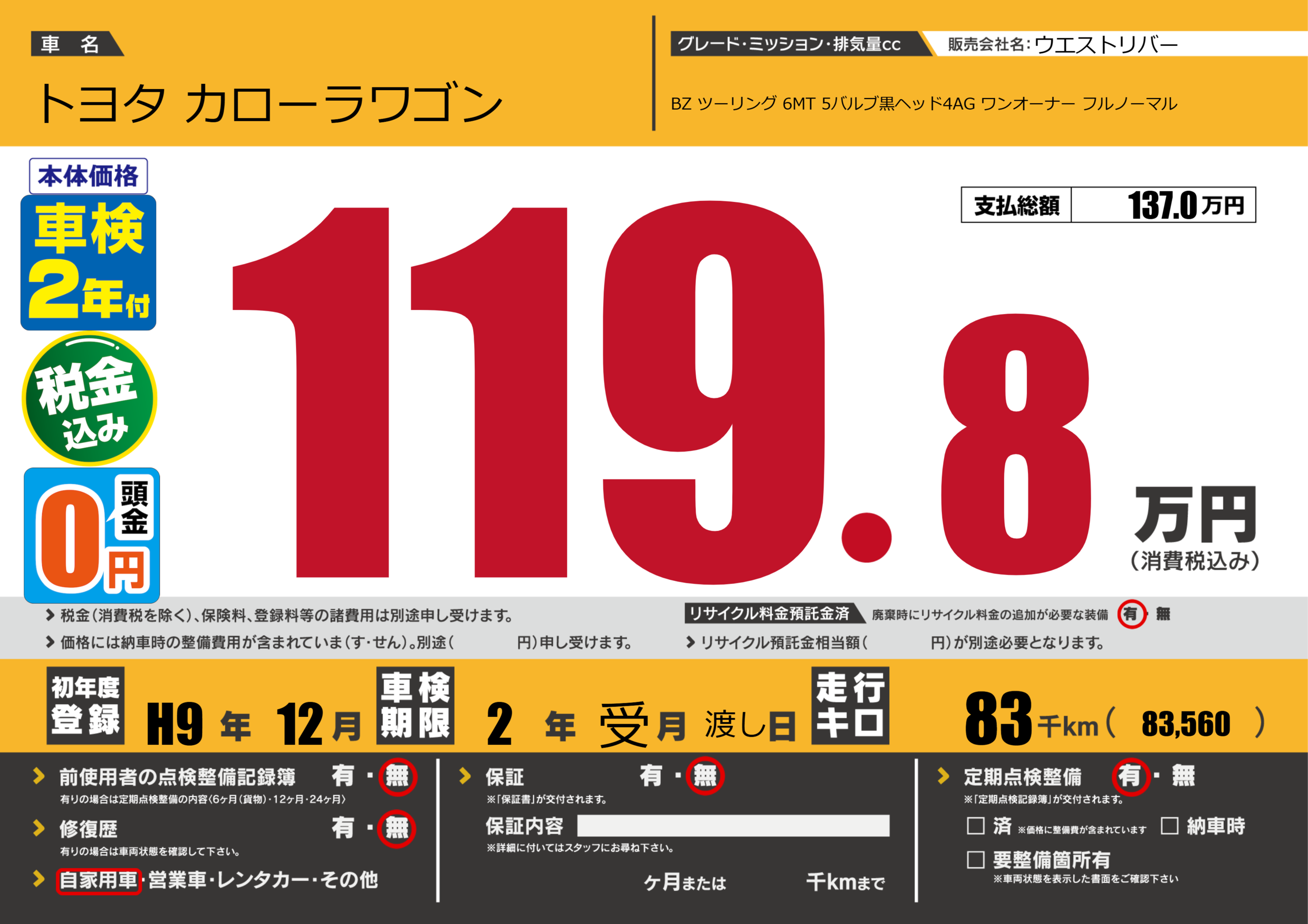 | 走行キロ | 8.3万km | 初年度登録 | H9年12月 |
