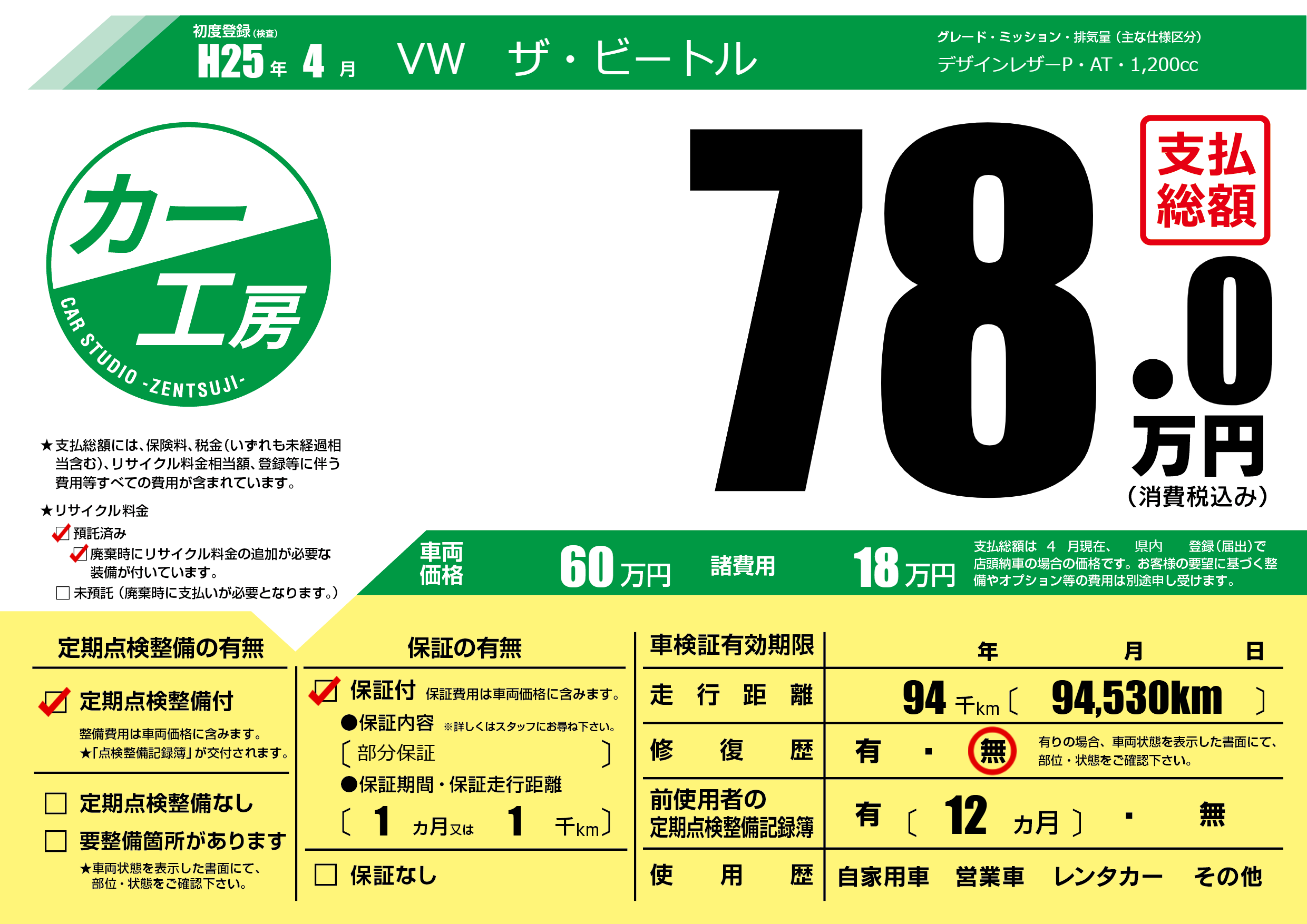 | 車名 | VW ザ・ビートル | グレード ミッション 排気量 |