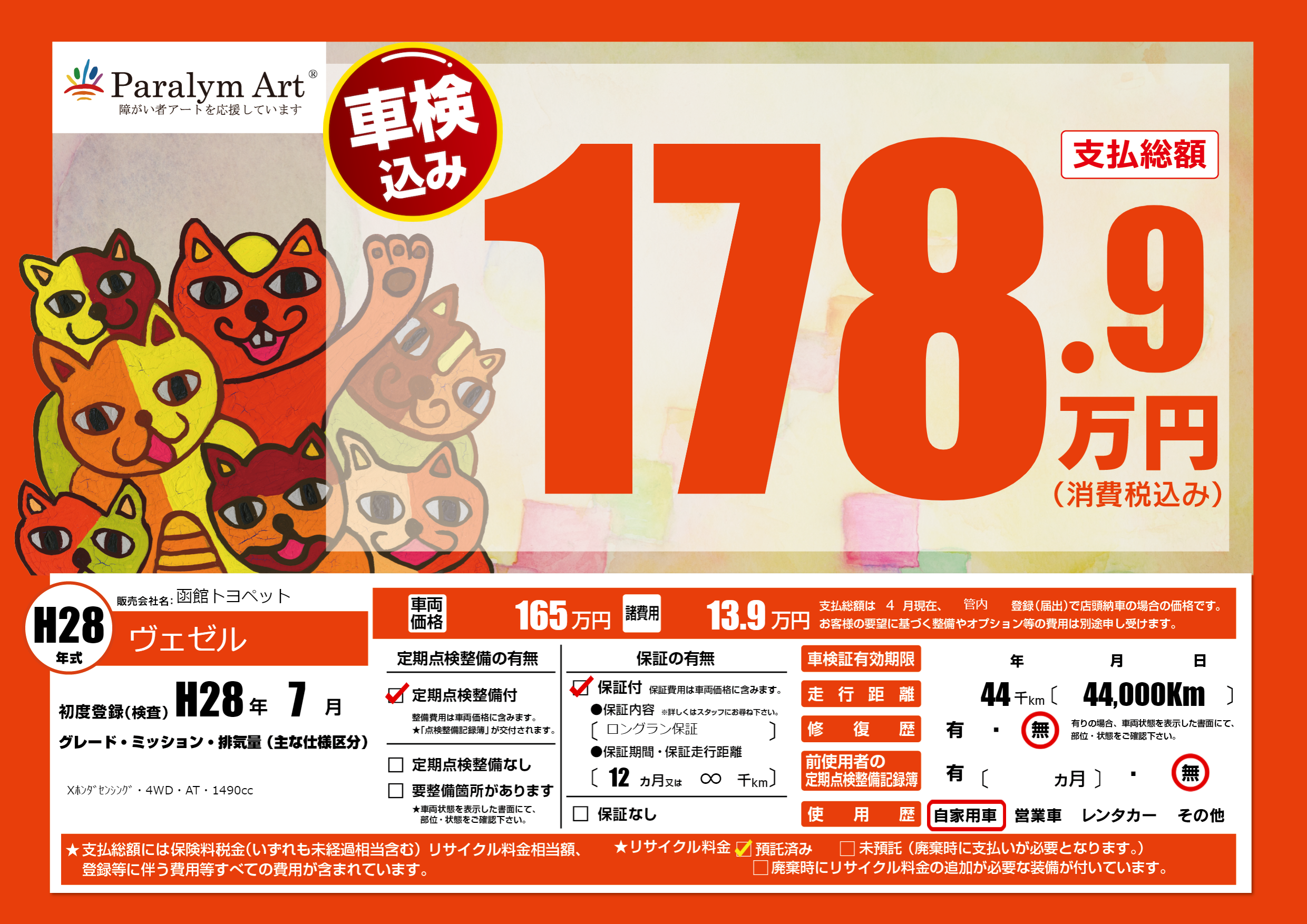 | 走行キロ | 4.4万km | 初年度登録 | H28年7月 |