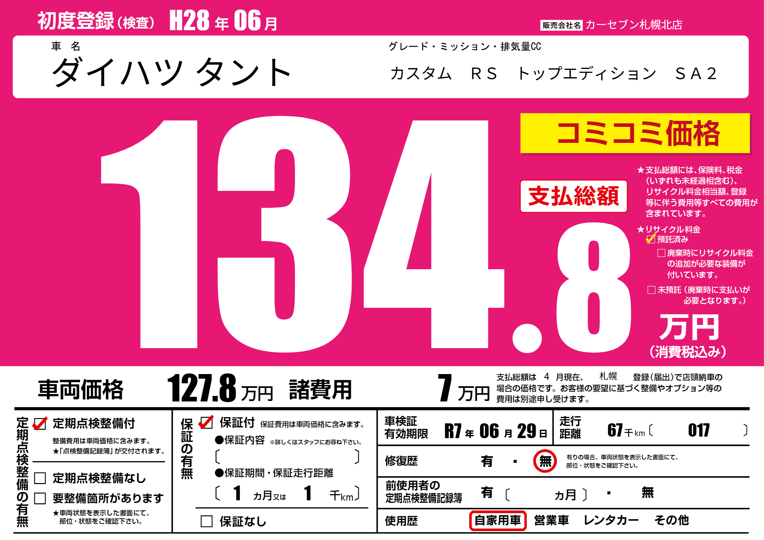 | 走行キロ | 6.7万km | 初年度登録 | H28年06月 |