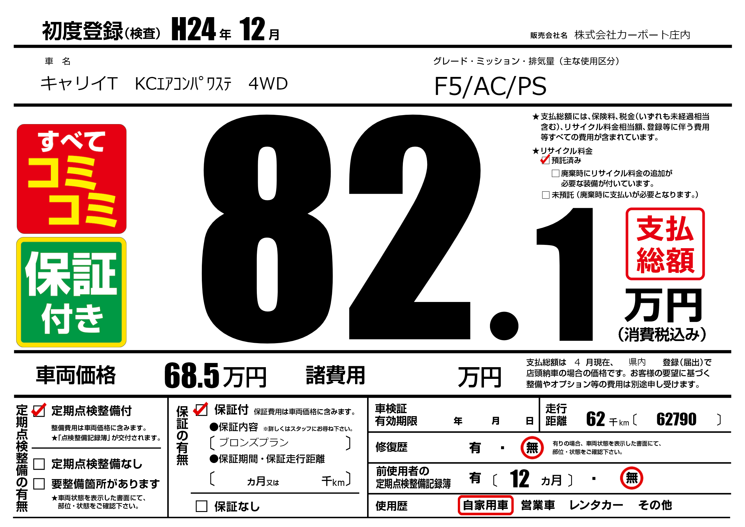 | 走行キロ | 6.2万km | 初年度登録 | H24年12月 |