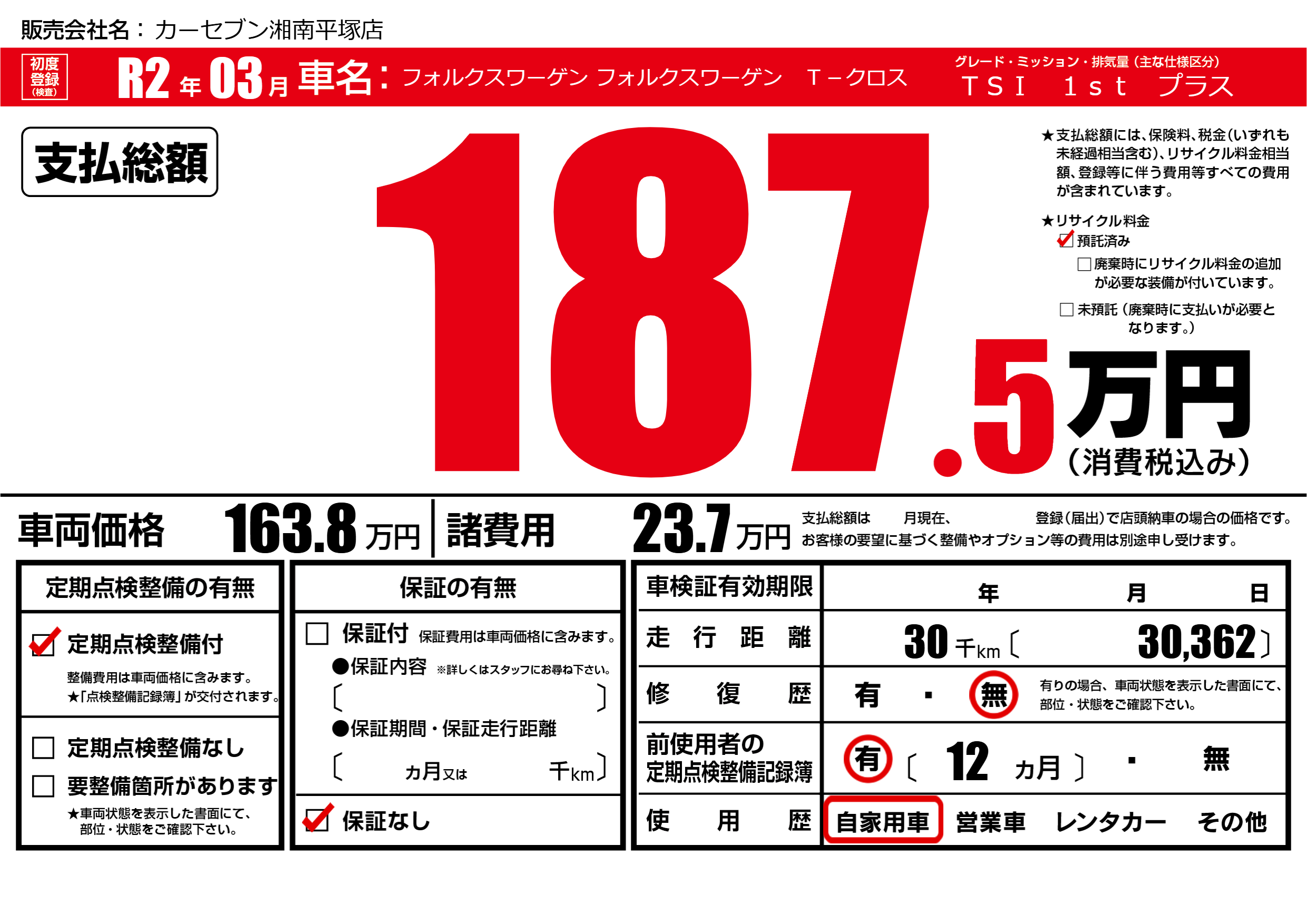 | 車名 | フォルクスワーゲン フォルクスワーゲン T-クロス | グレード ミッション 排気量 |